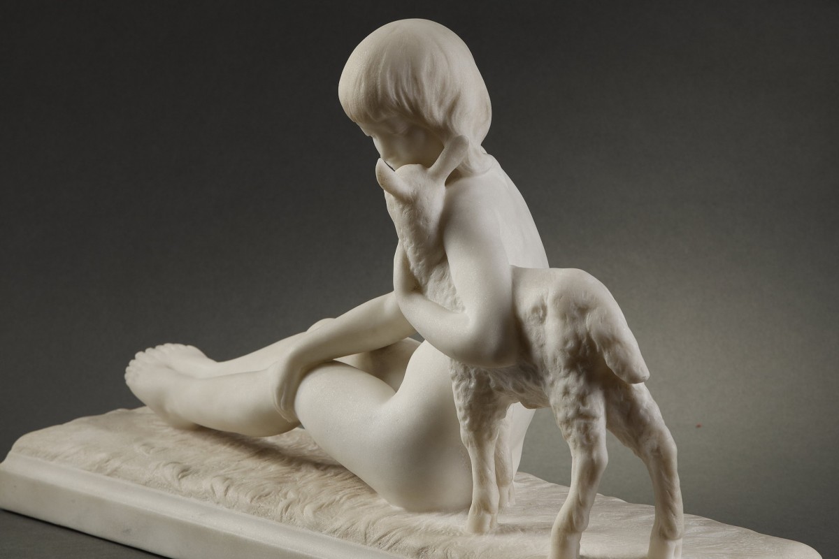 Retrouver le mobilier ou les objets d''art similaires à « Enfant et Agneau - Albert Patrisse (1892-1964) » présenté par Artimo, antiquaire à Brussels dans la catégorie Sculpture en Marbre Art Déco, Sculpture.