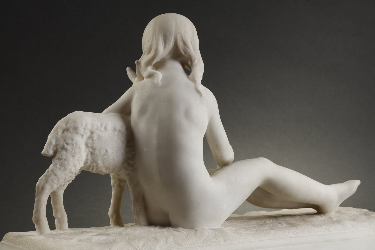 Cette sculpture représente une scène délicate et émotive d'une jeune fille assise, câlinant un agneau. La figure féminine est représentée nue, assise de manière détendue, avec ses jambes étendues devant elle. Son bras droit repose sur ses jambes, tandis que son bras gauche est levé, tenant doucement la tête de l'agneau contre sa joue. La jeune femme regarde l'agneau avec tendresse, créant une atmosphère de douceur et de calme.