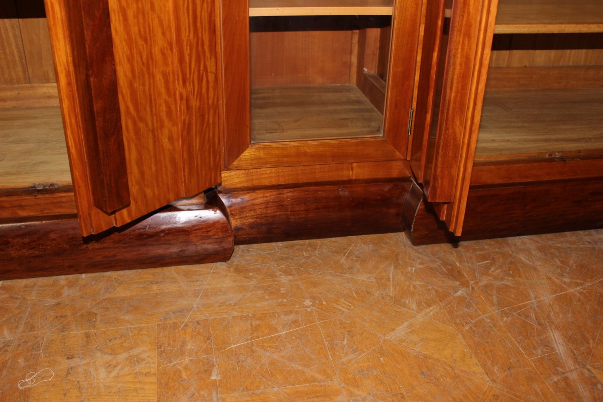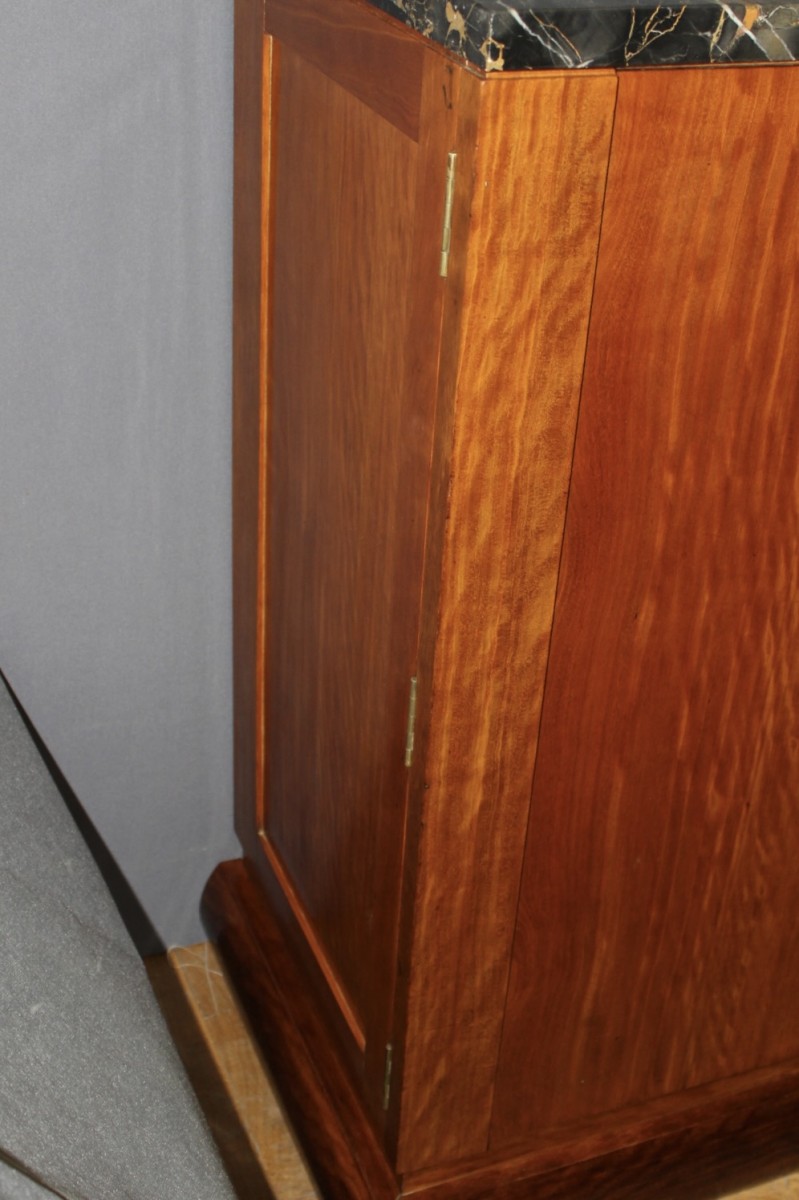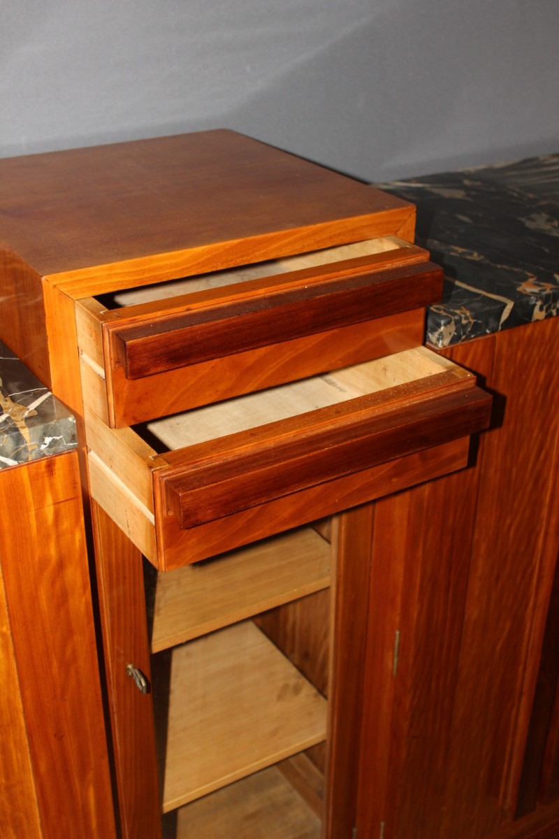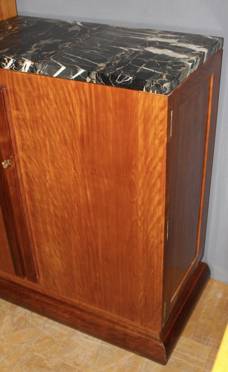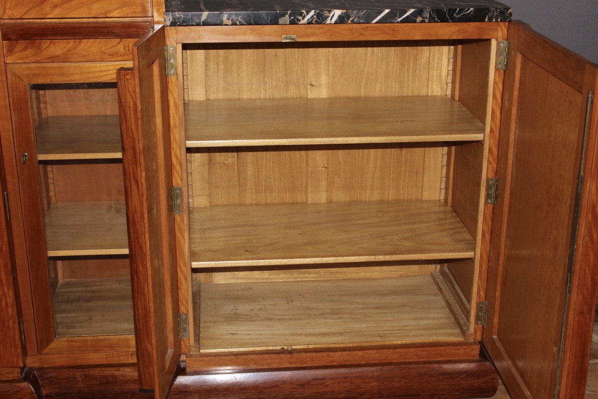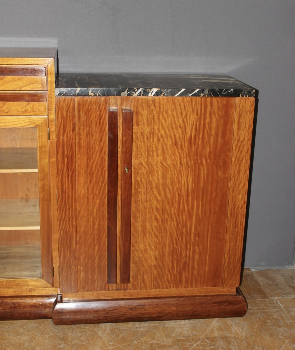 Enfilade d'époque Art Déco en acajou attribué à André Sornay 1902/2000 , elle ouvre par deux doubles portes asymétriques , une porte vitrée et deux tiroirs , rayons intérieurs réglables dont un avec tiroir , dessus de marbre , hauteur des parties à marbre 104,5 cm , finition vernis , meuble démontable en trois parties , ensemble en très bon état