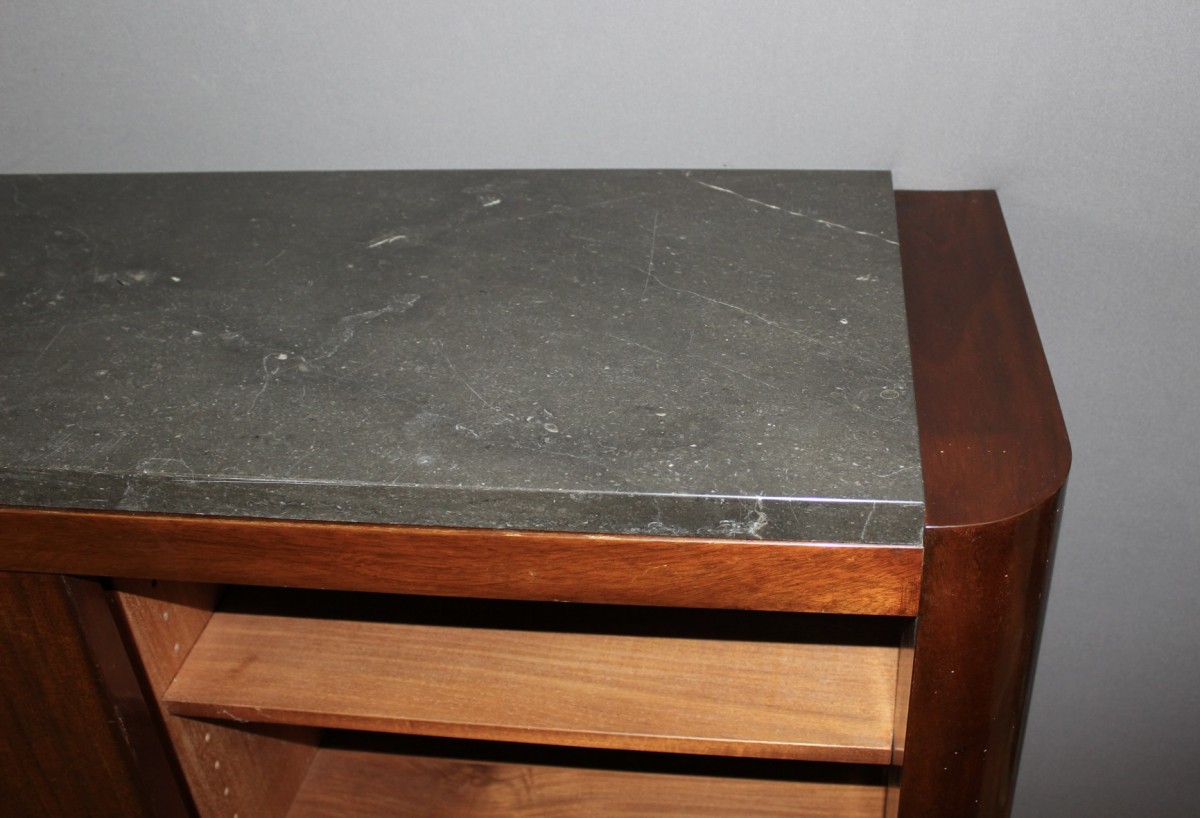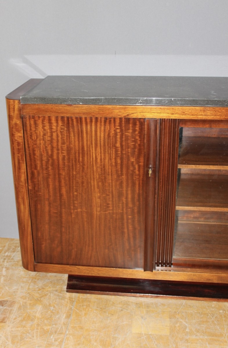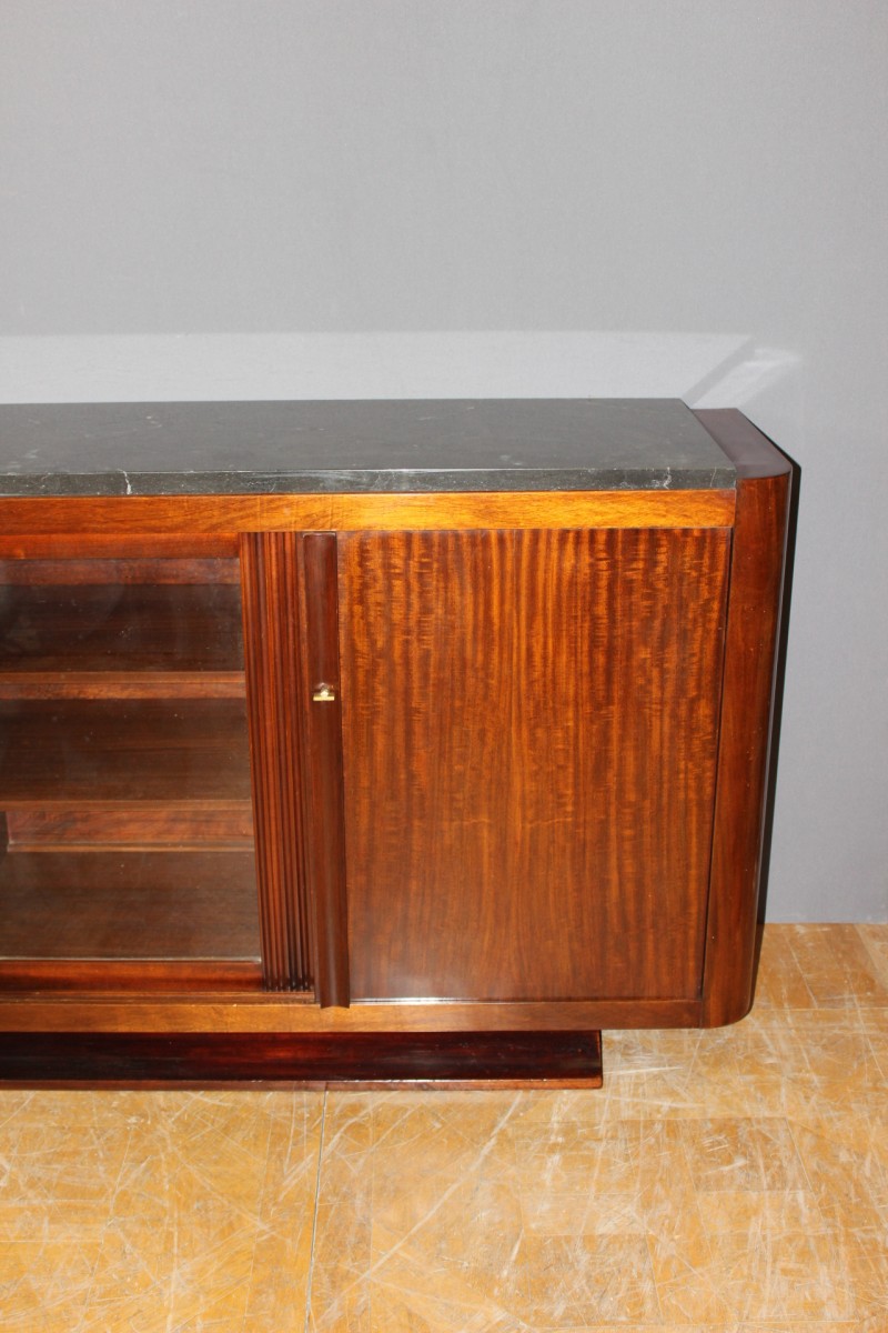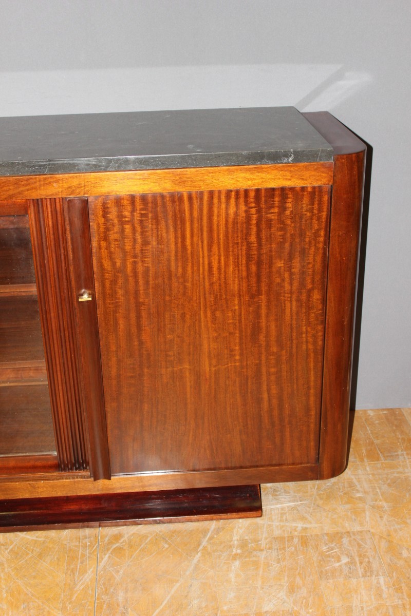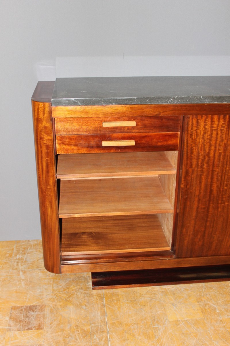 Enfilade d'époque art déco en acajou massif , elle ouvre par trois portes coulissantes dont une vitrée , dessus de marbre noir , deux tiroirs intérieurs , finition vernis , ensemble en très bon état