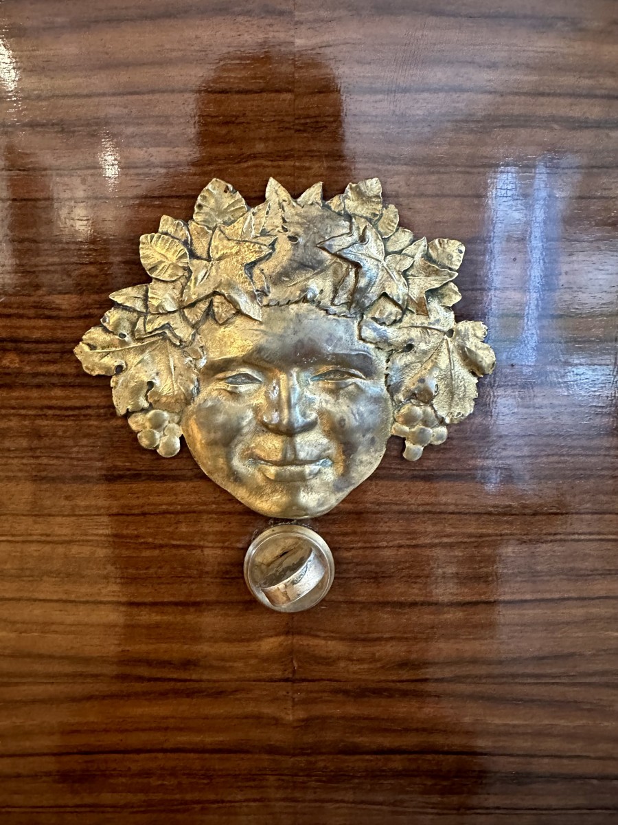 Le panneau central est orné d’une très expressive tête de Bacchus en bronze ciselé et doré,belle patine.