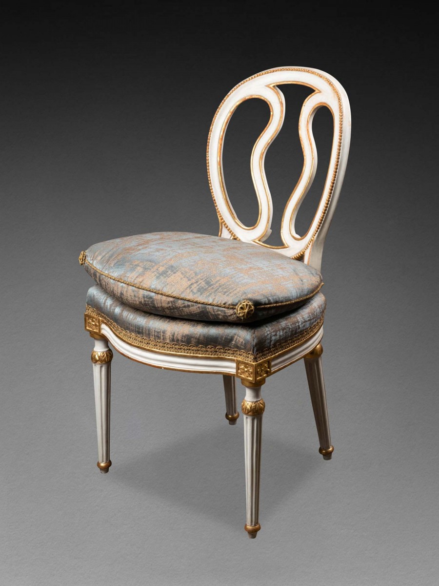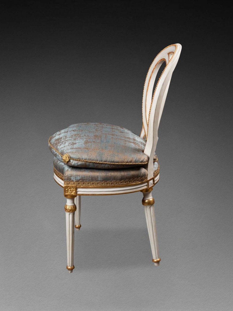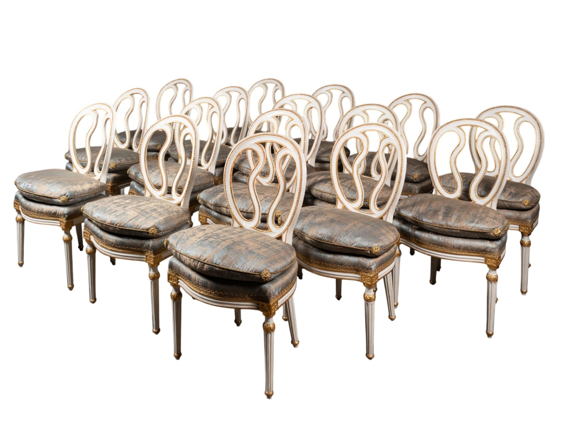 Ensemble de seize chaises d'époque Louis XVI (Principauté de Liège) en bois blanc et or. Les dossiers présentent un médaillon perlé et une structure ajourée aux courbes élégantes et fluides. Les pieds fuselés et cannelés sont surmontés d'un bloc de liaison sculpté, orné d'une rosace, d'un anneau doré en forme de feuille d'acanthe et d'une bande dorée à la base. Les pieds arrière sont évasés.