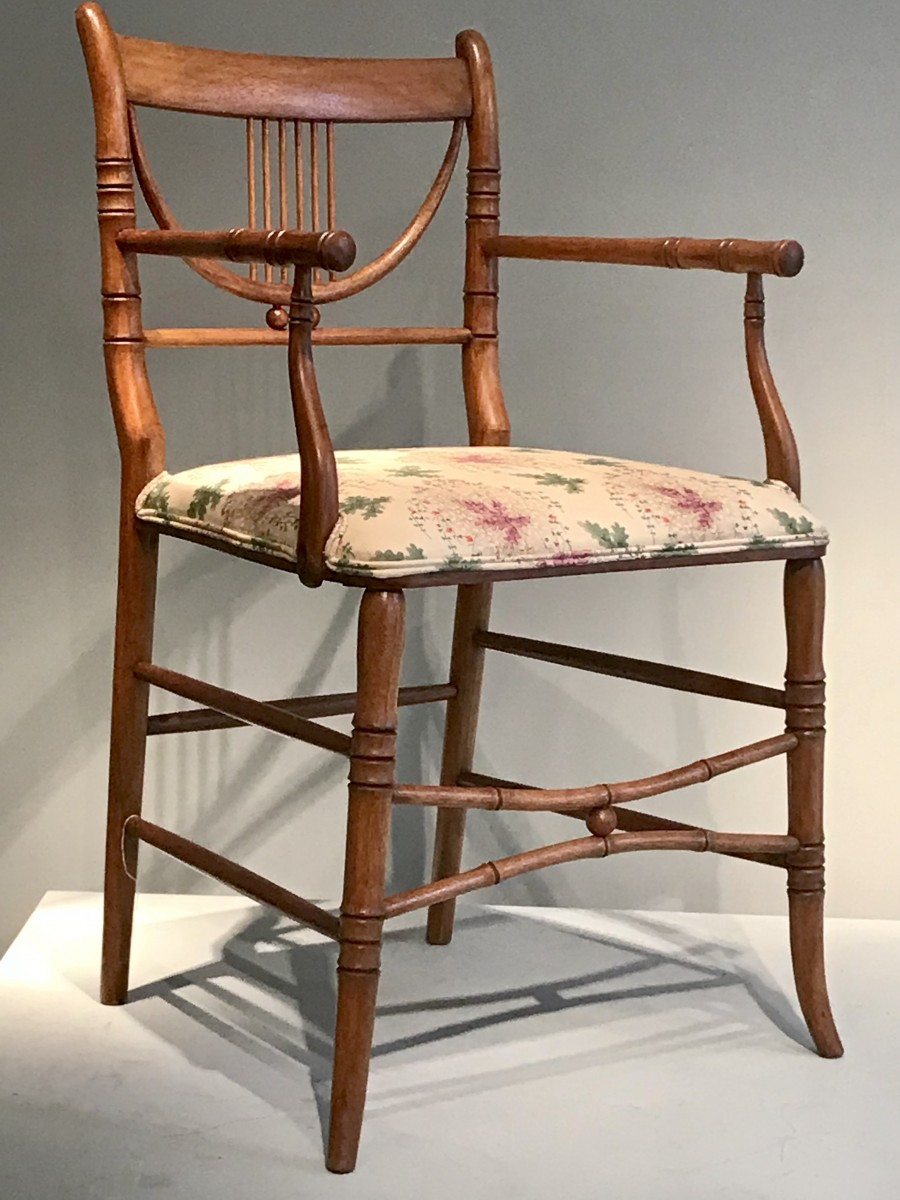 Ensemble de sièges , cinq chaises et deux fauteuils, d'inspiration Regency à l'imitation du bambou, en acajou satiné blond.