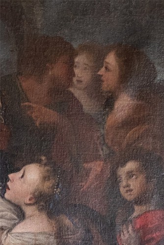 Ce tableau s’inscrit dans l’entourage d’Antonio Fumiani (1645-1710), peintre connu pour son style théâtral et monumental, particulièrement visible dans ses grandes compositions décoratives. Fumiani excellait dans la création d’espaces narratifs grandioses, caractérisés par des gestes expressifs et un usage magistral du clair-obscur pour amplifier l’effet dramatique. Ces éléments, associés à une attention minutieuse portée aux textures et à une composition scénique élaborée, se retrouvent dans cette œuvre.