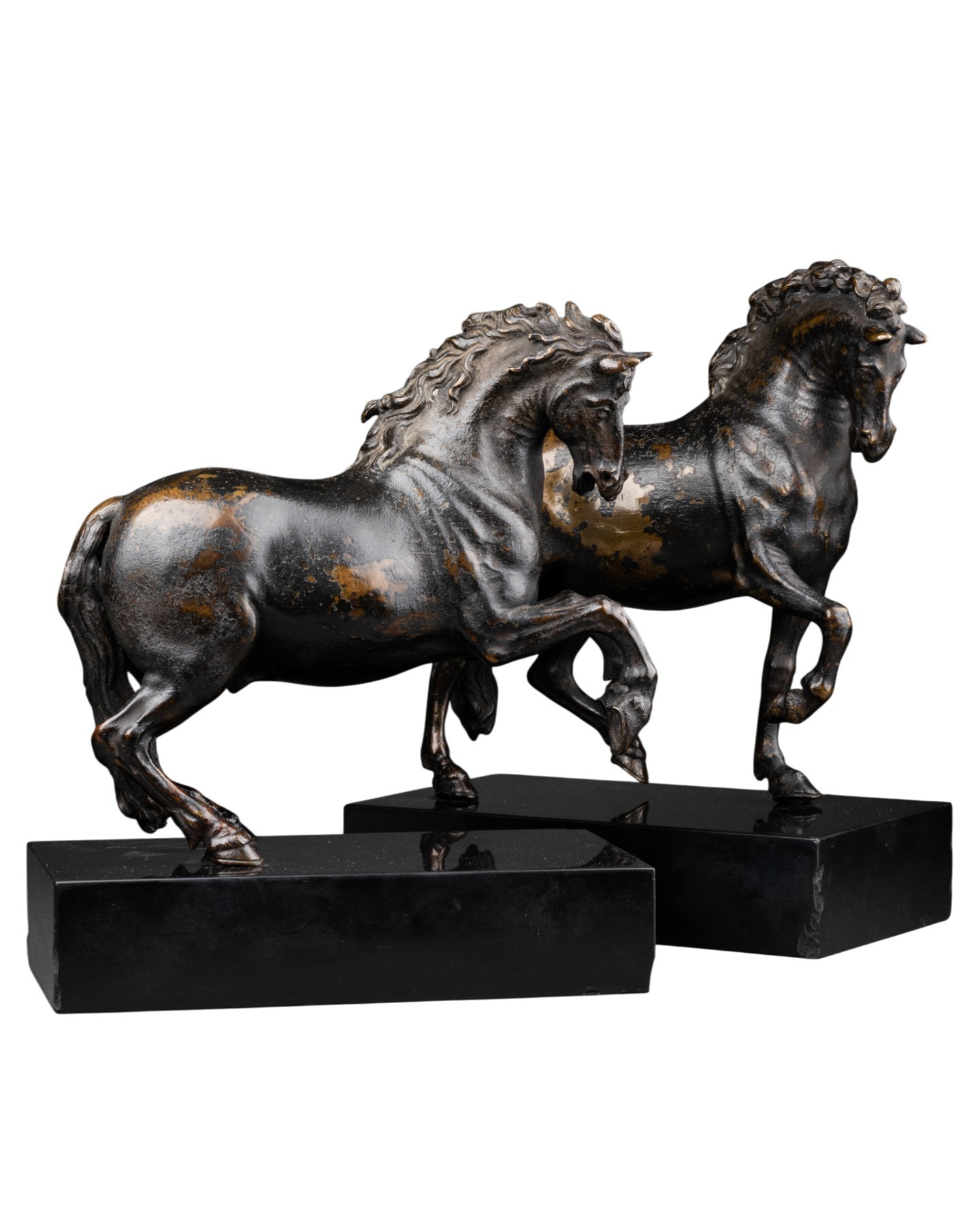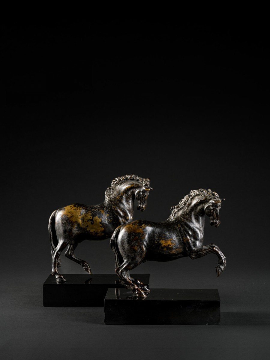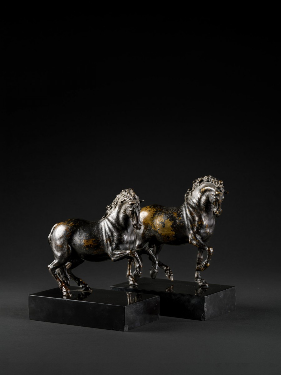 Cette paire d’étalons, l’un au pas amblé et l’autre cabré, constitue un remarquable exemple d’un groupe de petites statuettes équestres en bronze attribuables, sur des bases documentaires, stylistiques et techniques, au sculpteur et orfèvre anglo-italien Francesco Fanelli (1577 – avant 1652).