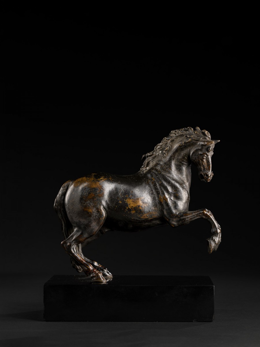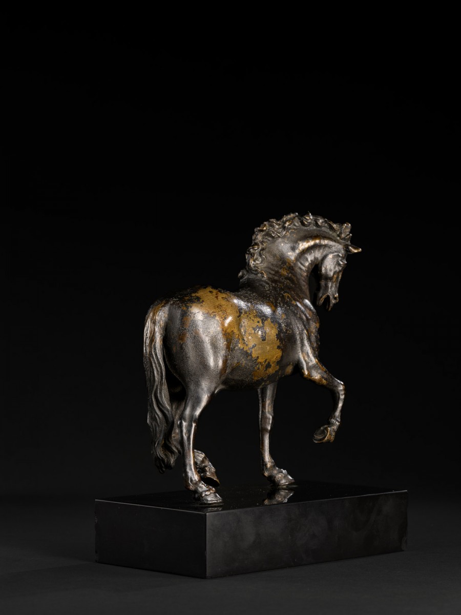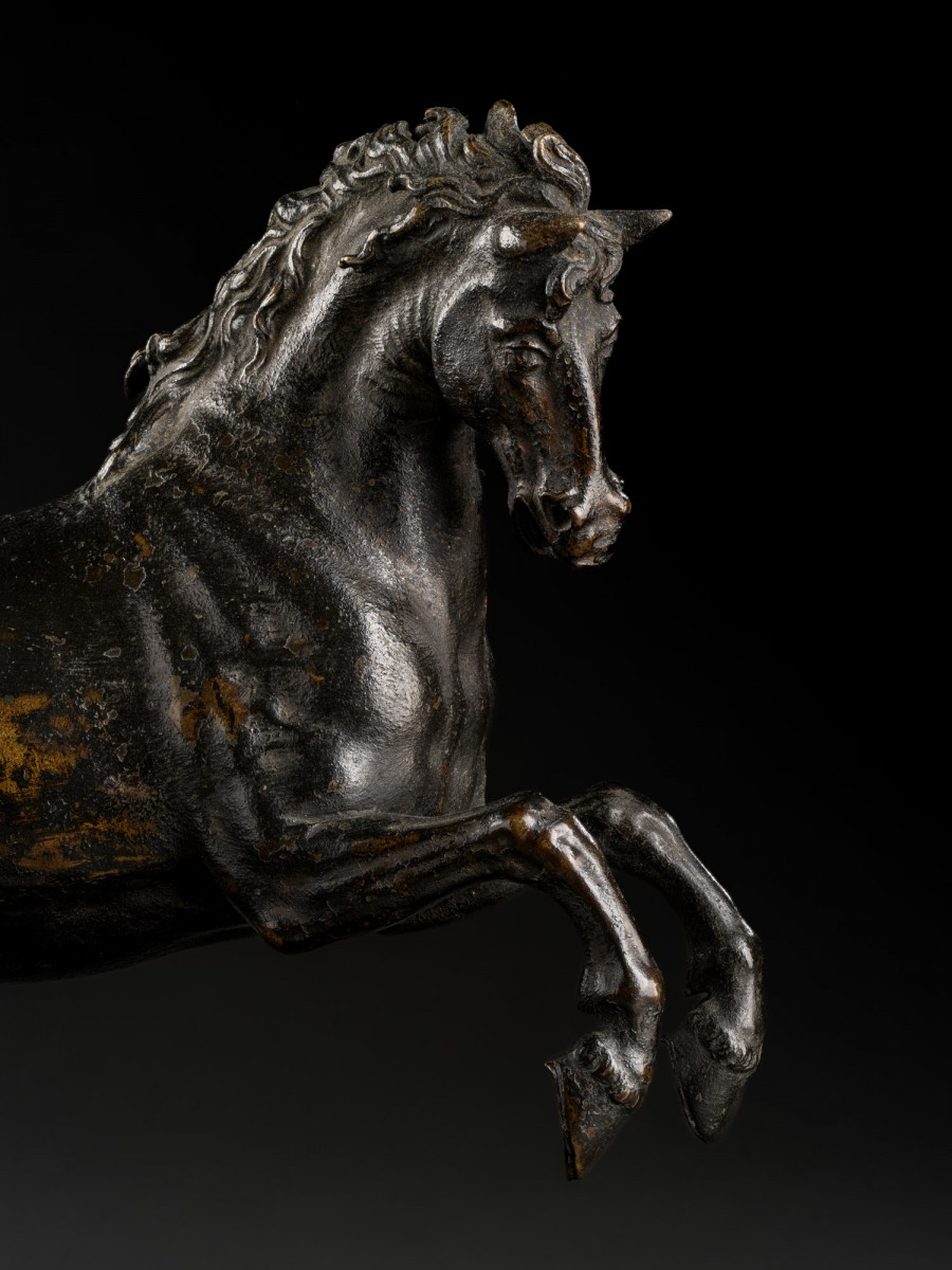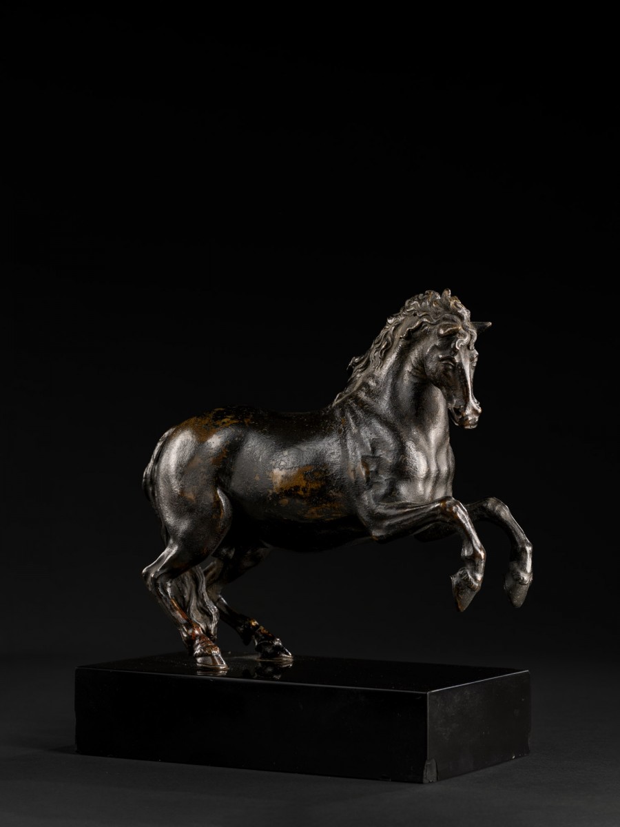 Cette paire d’étalons, l’un au pas amblé et l’autre cabré, constitue un remarquable exemple d’un groupe de petites statuettes équestres en bronze attribuables, sur des bases documentaires, stylistiques et techniques, au sculpteur et orfèvre anglo-italien Francesco Fanelli (1577 – avant 1652).