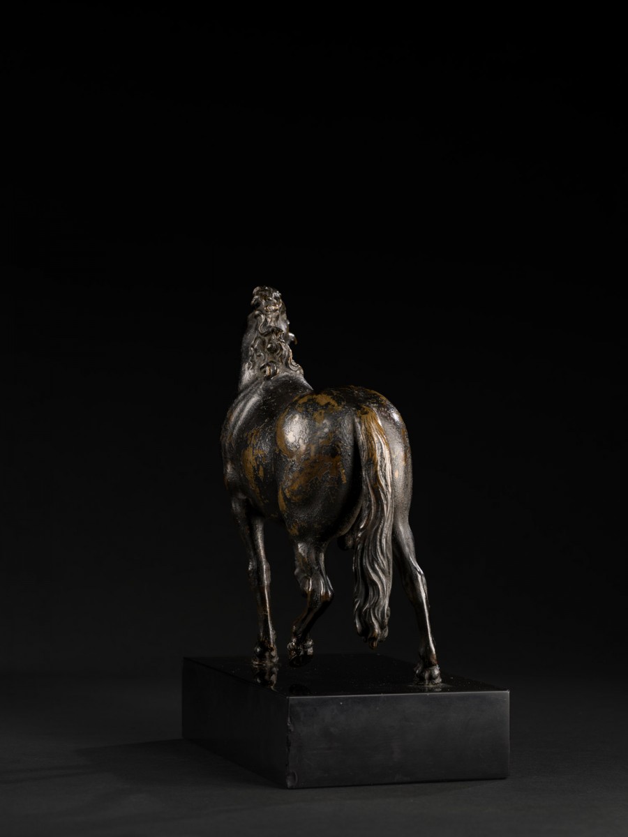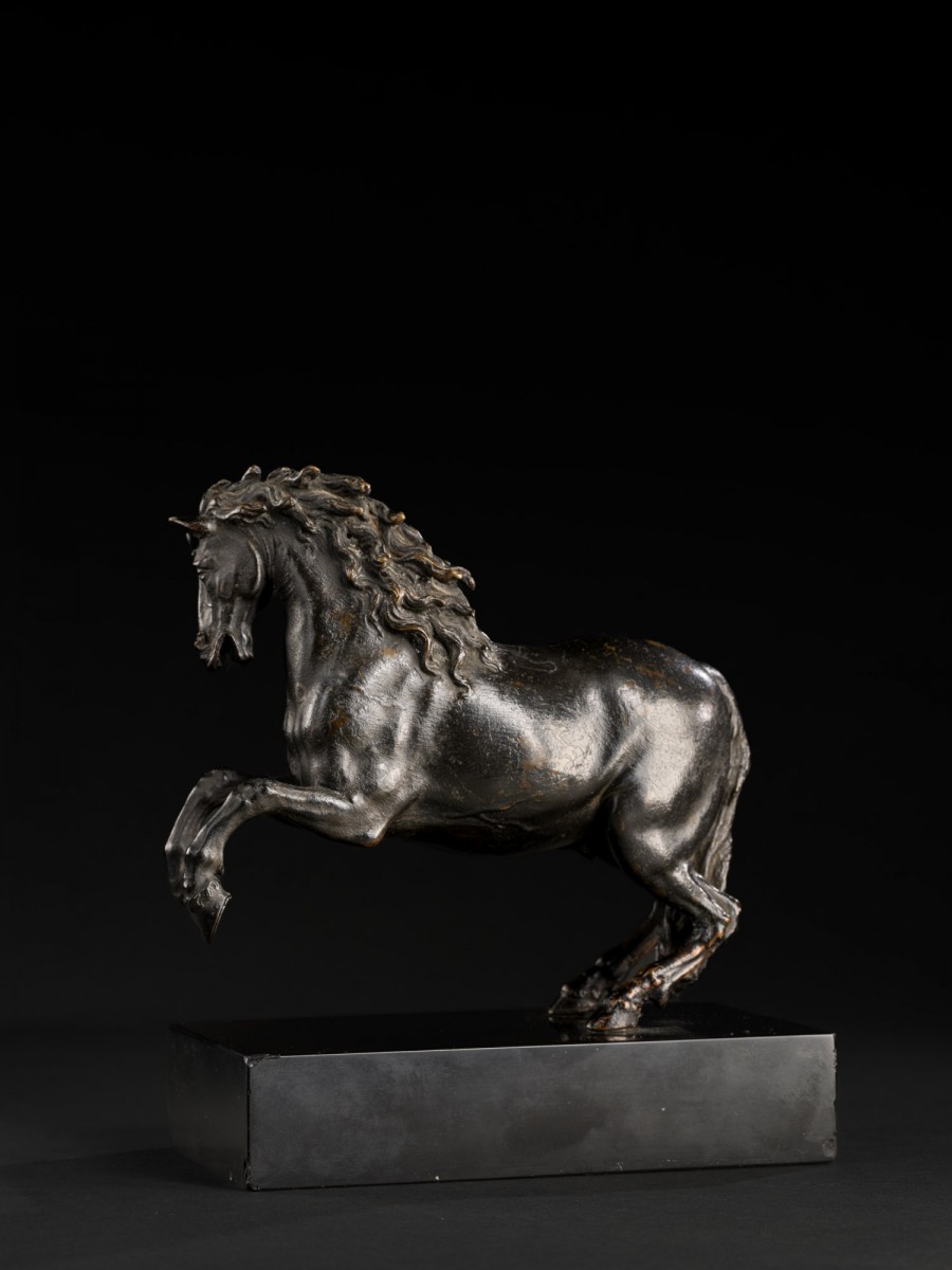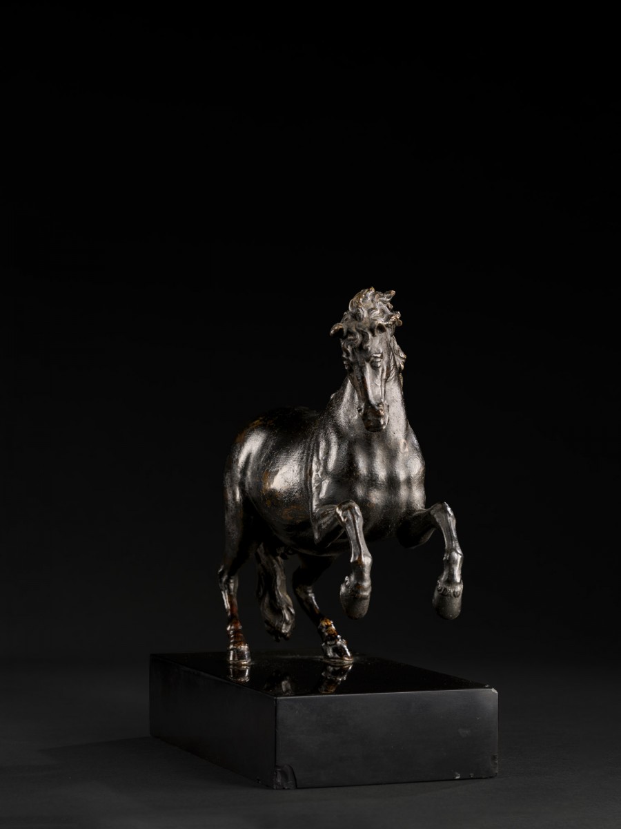 La facture des deux bronzes correspond étroitement à celle des autres petits bronzes réalisés par Fanelli, en particulier durant sa période anglaise au début des années 1630. Le peintre allemand Joachim Sandrart, contemporain de l’artiste, commenta sa technique dans la Teutsche Akademie : « il excellait particulièrement dans la fonte des images métalliques et parvenait à restituer le modèle dans tous ses détails avec une telle netteté qu’il n’était pas nécessaire d’améliorer la sculpture par incision ou par reprise au ciseau ; il maîtrisait son art à un point tel qu’il savait couler des sculptures de dimensions importantes avec des parois d’une épaisseur comparable à celle d’un Reichsthaler [env. 2 mm], et, en témoignage de son habileté, je possède moi-même plusieurs œuvres en métal de sa main ». Les deux chevaux sont finement modelés, avec, comme l’indiquait Sandrart, un minimum de reprises visibles à la surface, notamment aux endroits où la patine noire épaisse s’est partiellement atténuée. Cette patine constitue par ailleurs une caractéristique très distinctive de la technique de Fanelli et se retrouve sur de nombreux bronzes qui lui sont aujourd’hui attribués.