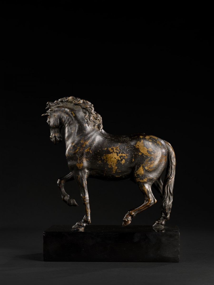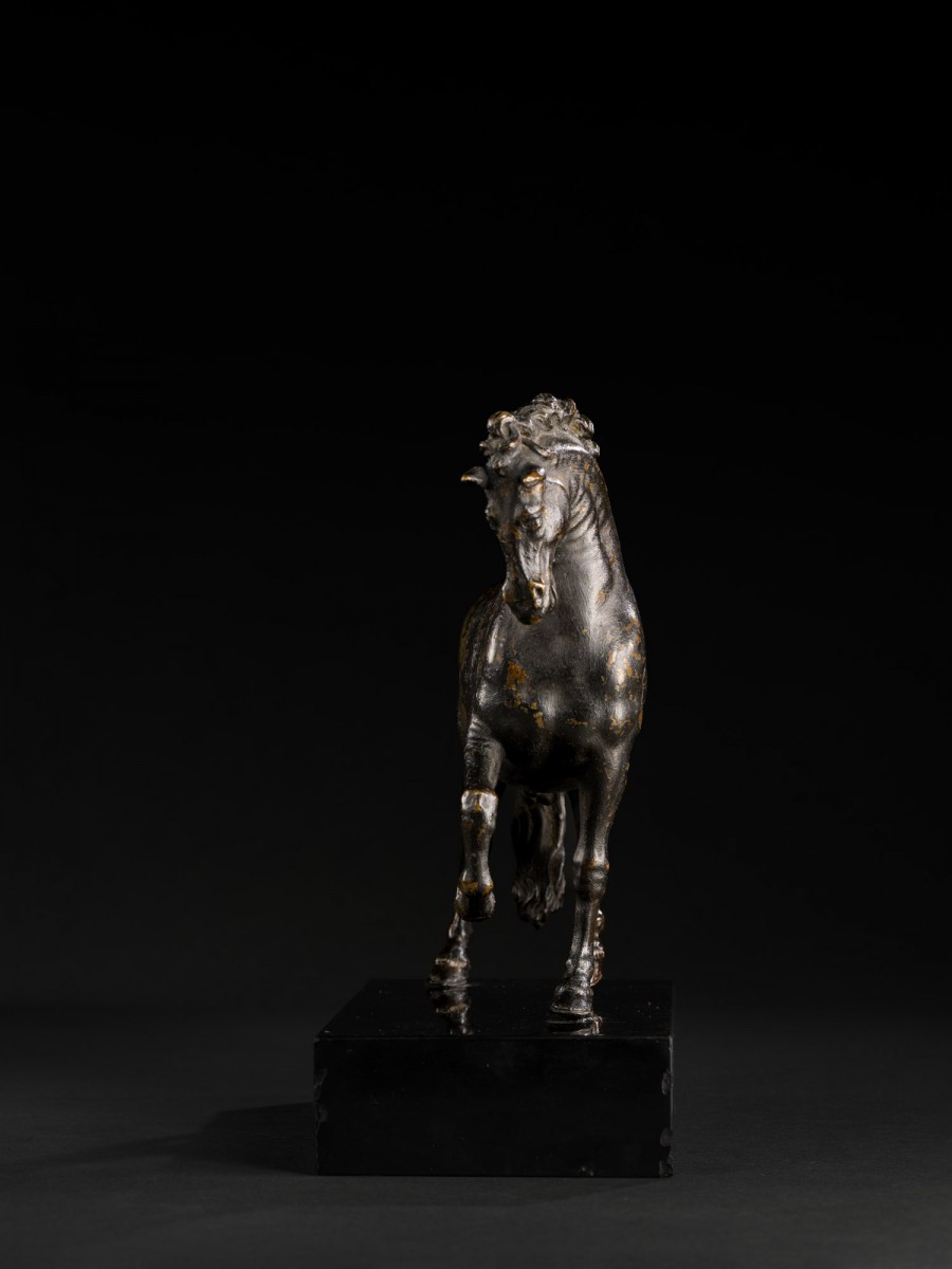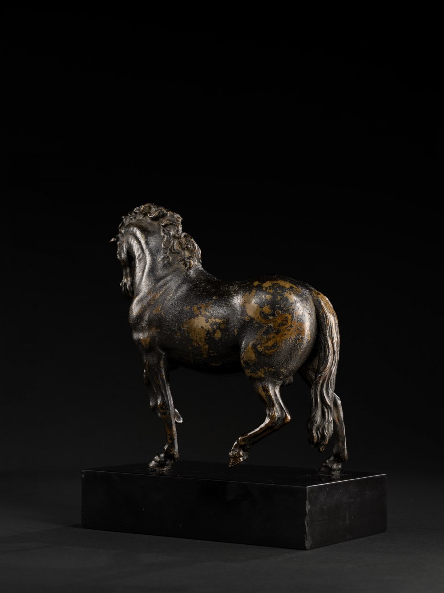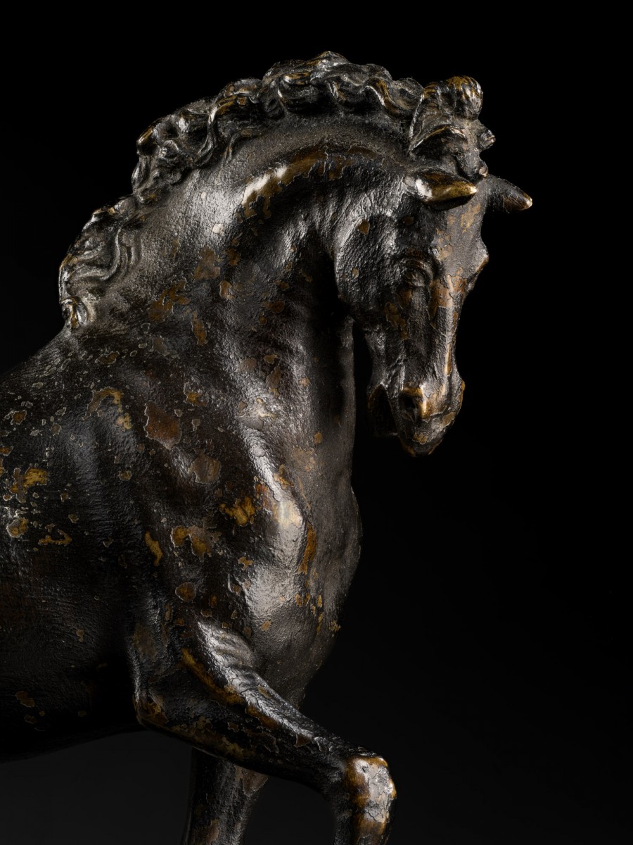 La facture des deux bronzes correspond étroitement à celle des autres petits bronzes réalisés par Fanelli, en particulier durant sa période anglaise au début des années 1630. Le peintre allemand Joachim Sandrart, contemporain de l’artiste, commenta sa technique dans la Teutsche Akademie : « il excellait particulièrement dans la fonte des images métalliques et parvenait à restituer le modèle dans tous ses détails avec une telle netteté qu’il n’était pas nécessaire d’améliorer la sculpture par incision ou par reprise au ciseau ; il maîtrisait son art à un point tel qu’il savait couler des sculptures de dimensions importantes avec des parois d’une épaisseur comparable à celle d’un Reichsthaler [env. 2 mm], et, en témoignage de son habileté, je possède moi-même plusieurs œuvres en métal de sa main ». Les deux chevaux sont finement modelés, avec, comme l’indiquait Sandrart, un minimum de reprises visibles à la surface, notamment aux endroits où la patine noire épaisse s’est partiellement atténuée. Cette patine constitue par ailleurs une caractéristique très distinctive de la technique de Fanelli et se retrouve sur de nombreux bronzes qui lui sont aujourd’hui attribués.