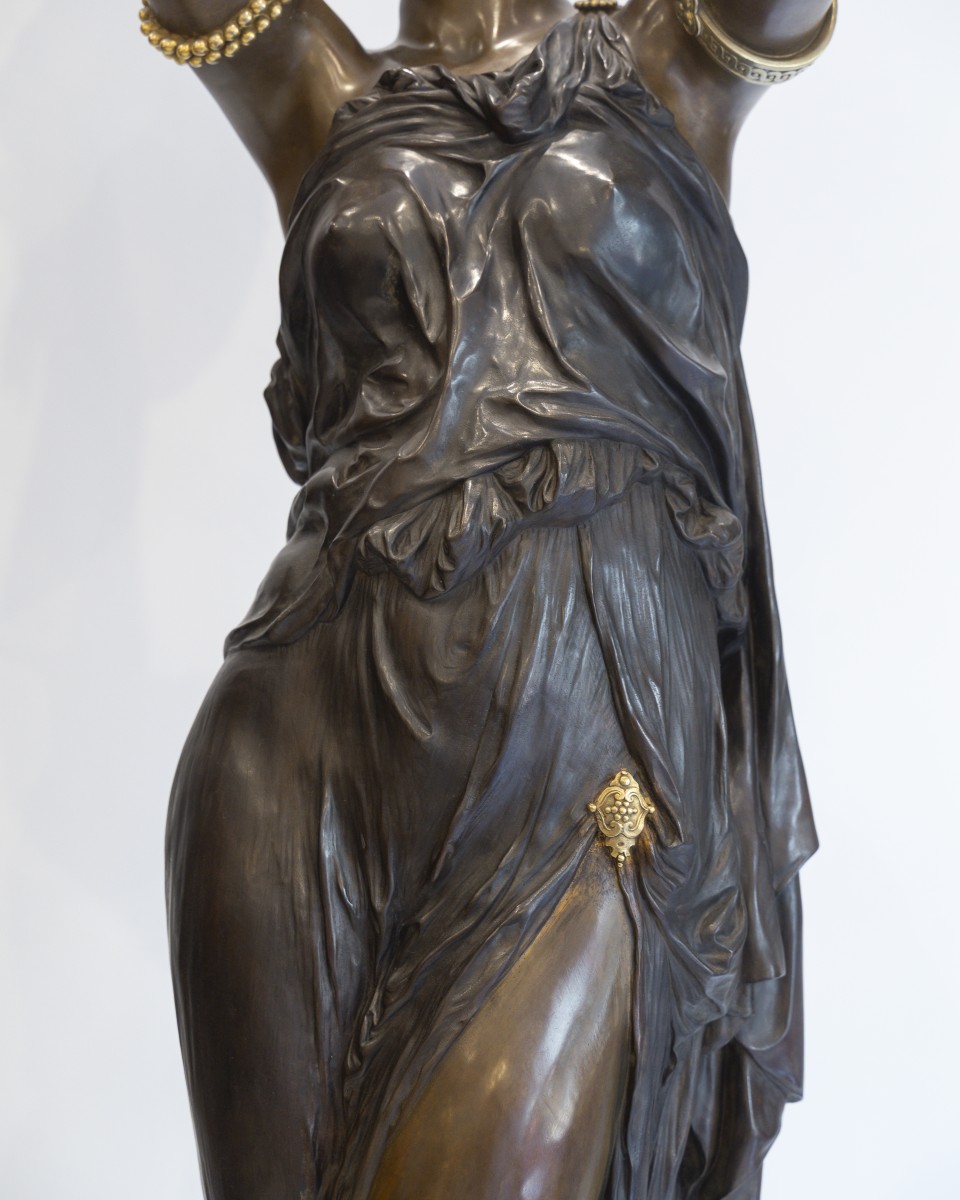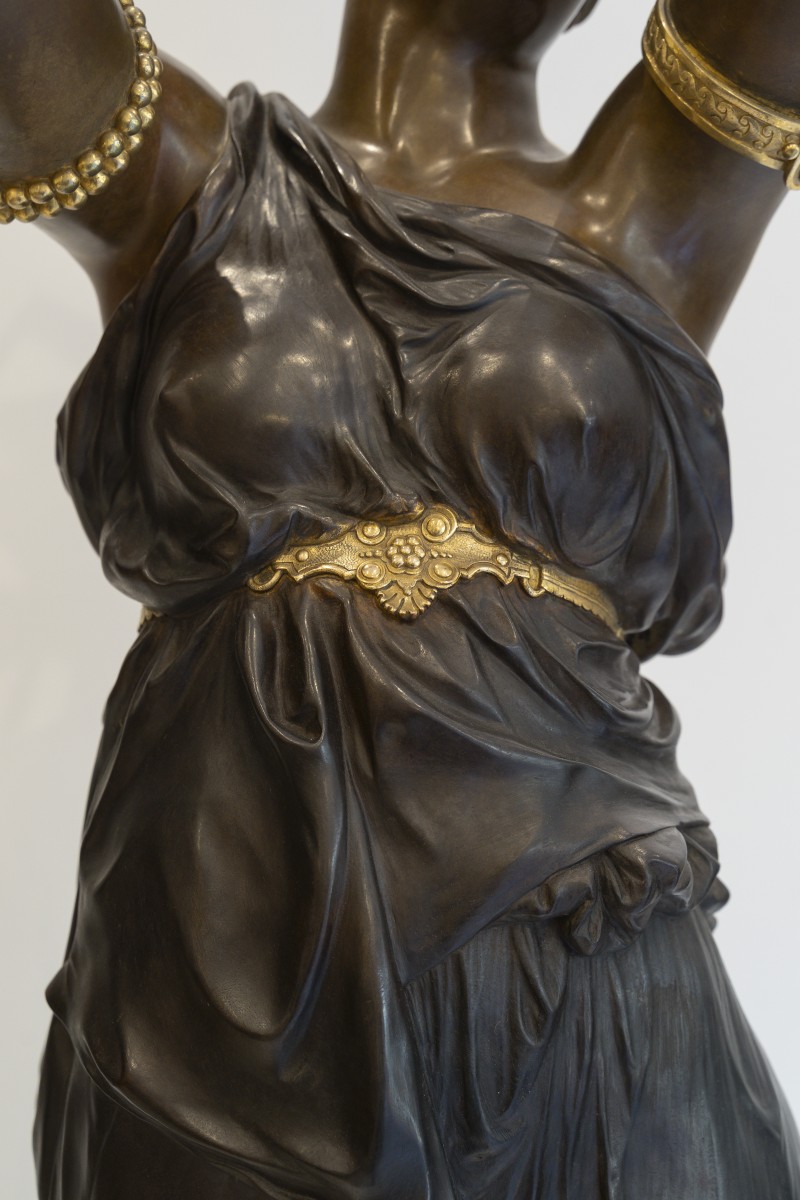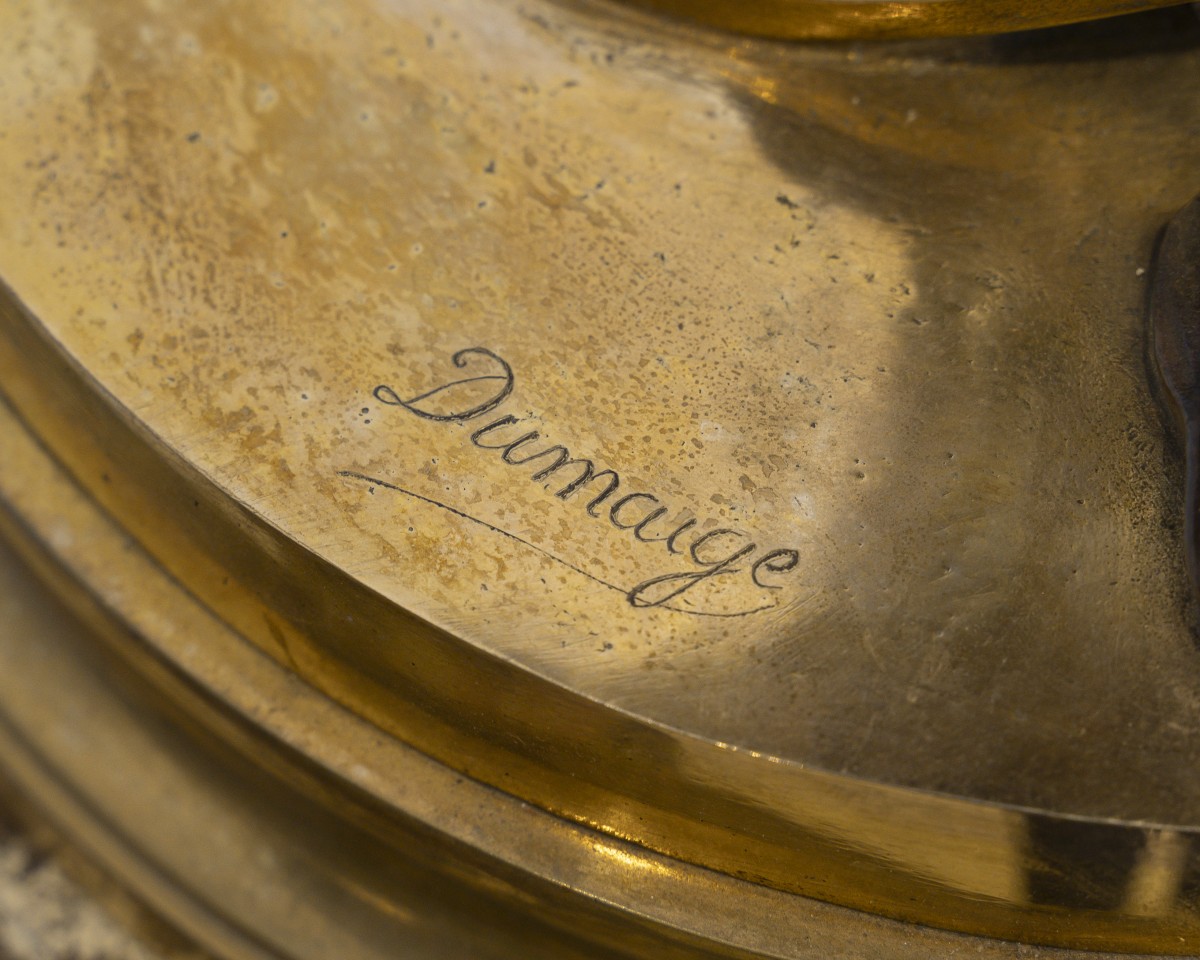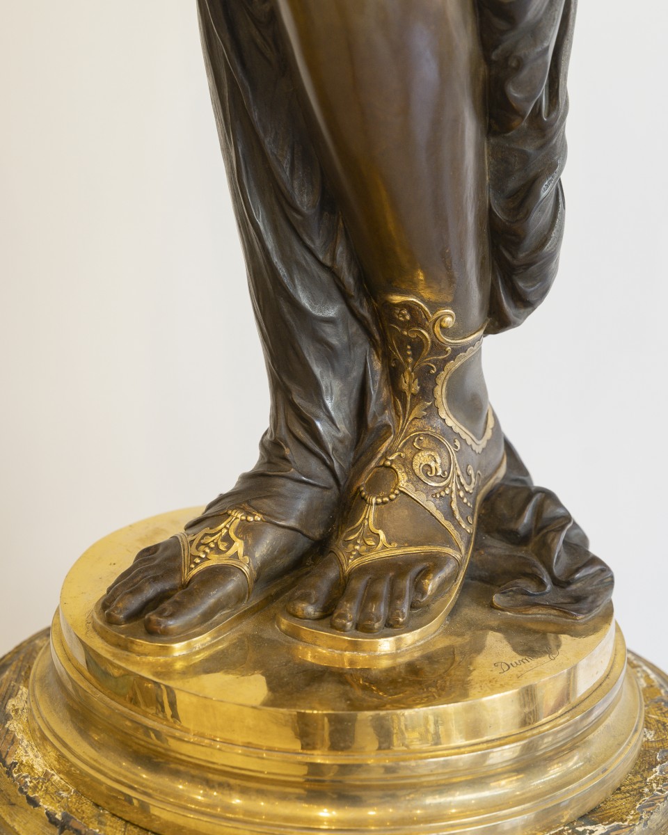 Dumaige démontre ici une parfaite maîtrise de la sculpture en bronze : les drapés sont rendus avec une virtuosité remarquable, tandis que les détails, bracelets, sandales, instruments sont rehaussés de bronze doré, dans un contraste raffiné avec la patine brune.