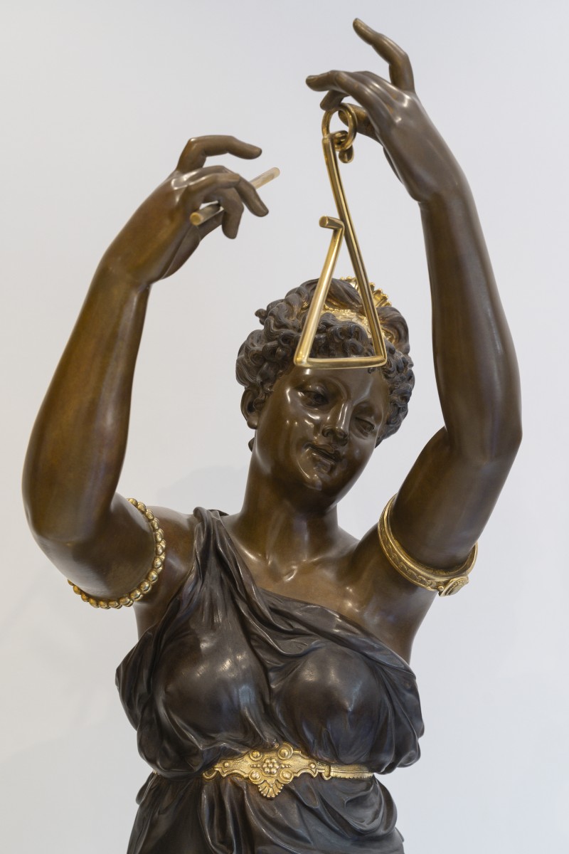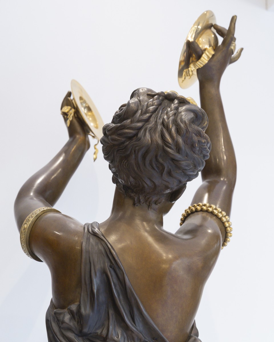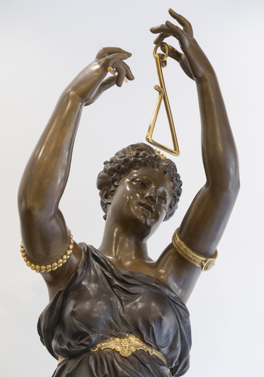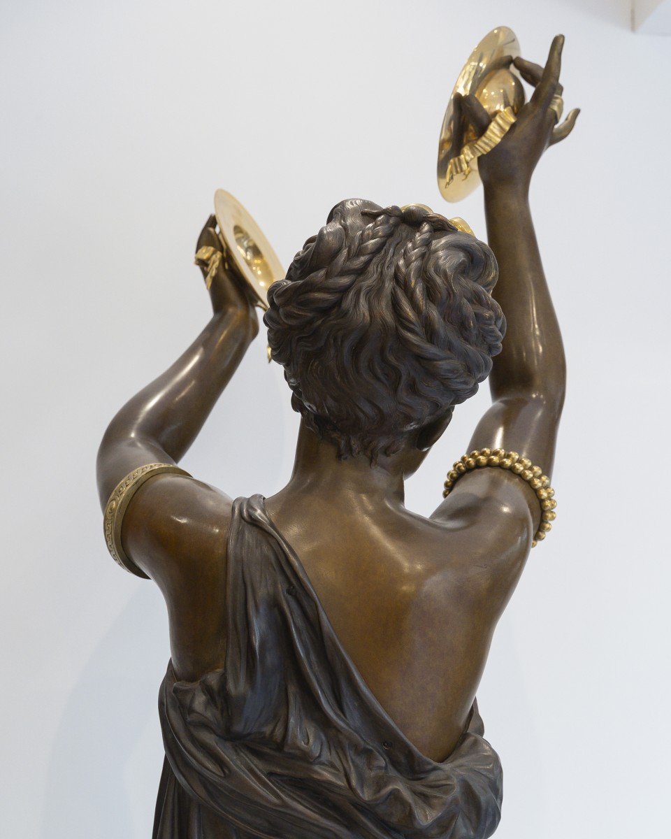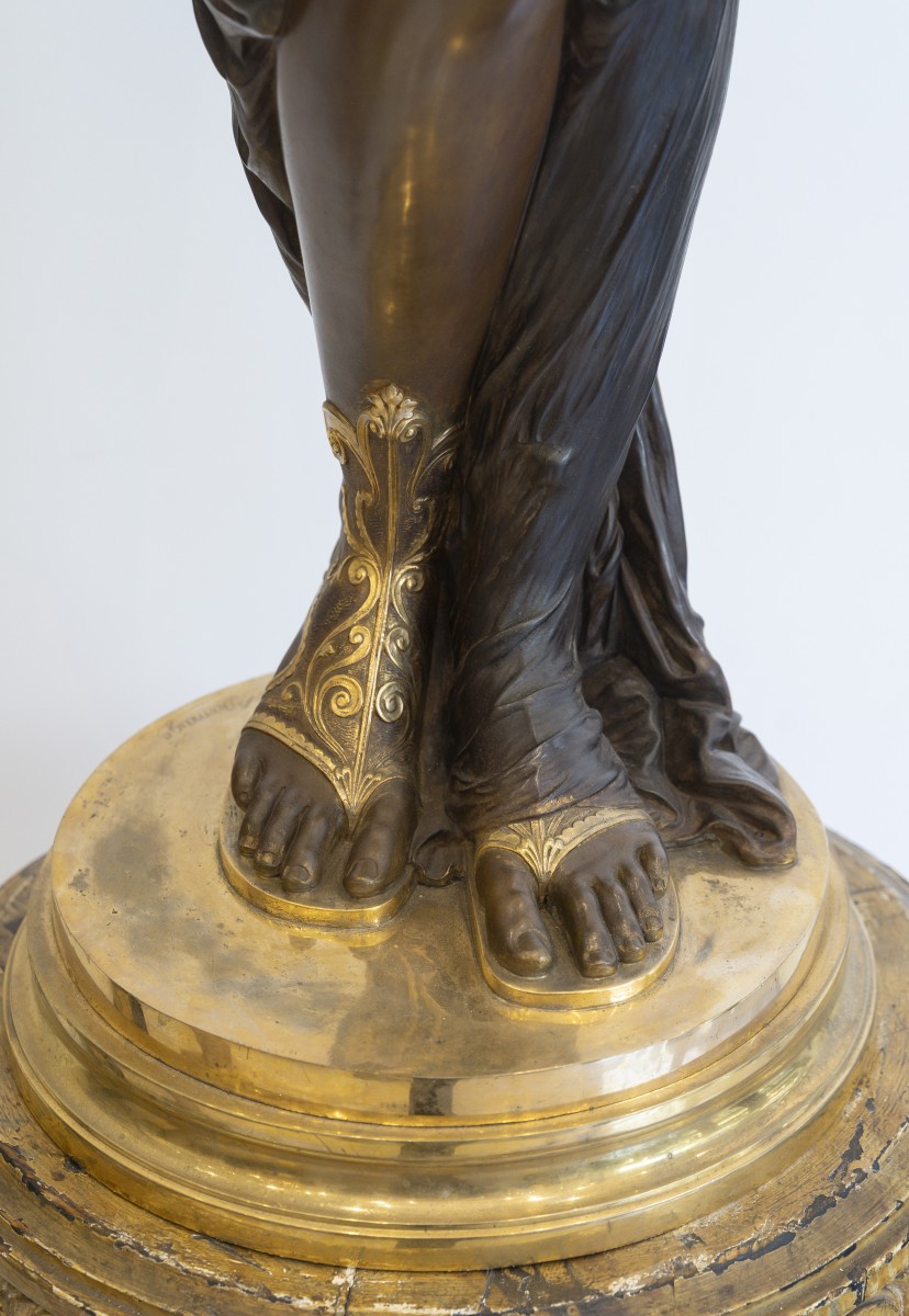 Dumaige démontre ici une parfaite maîtrise de la sculpture en bronze : les drapés sont rendus avec une virtuosité remarquable, tandis que les détails, bracelets, sandales, instruments sont rehaussés de bronze doré, dans un contraste raffiné avec la patine brune.