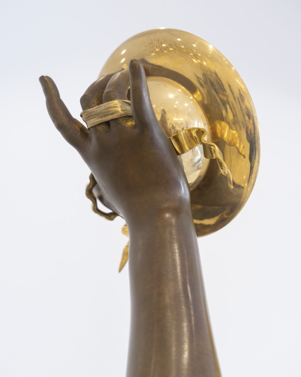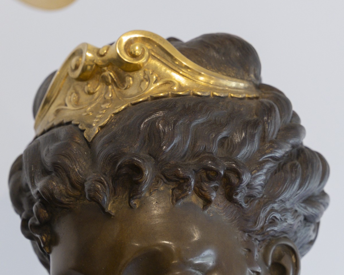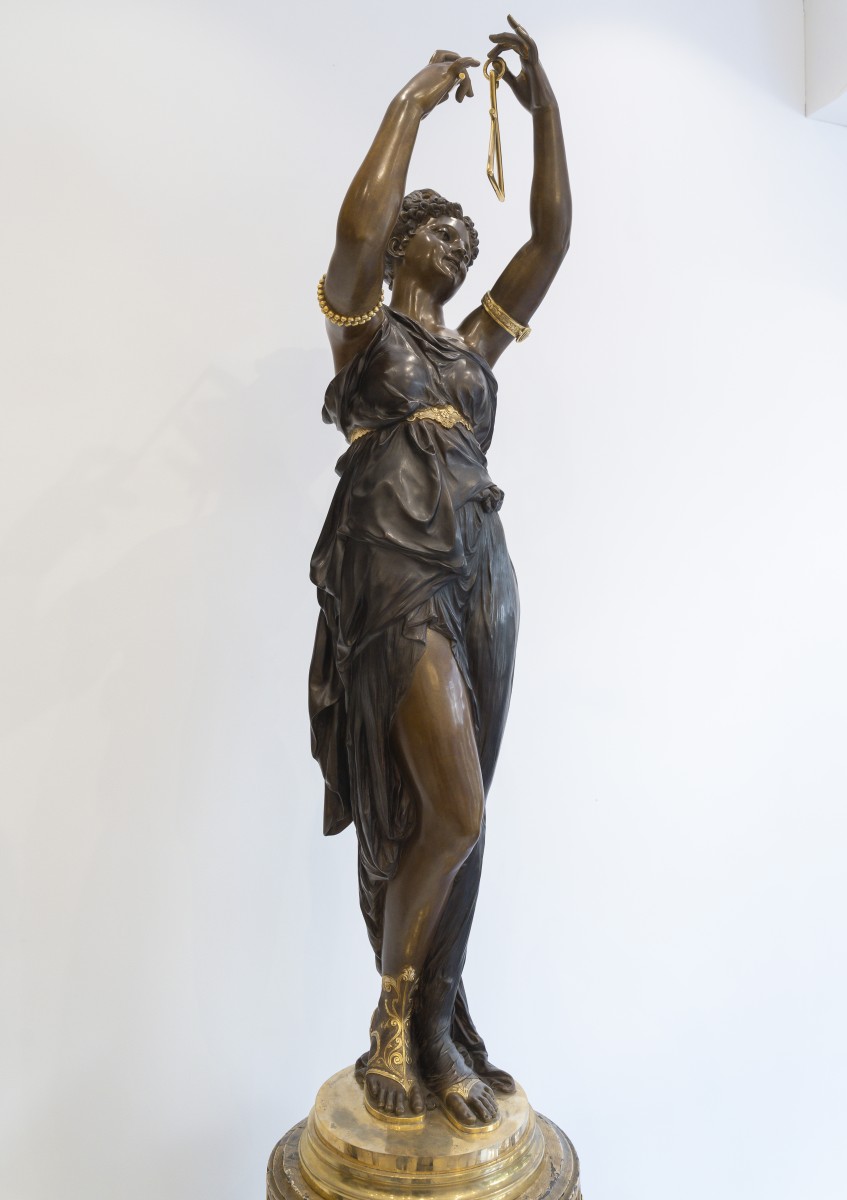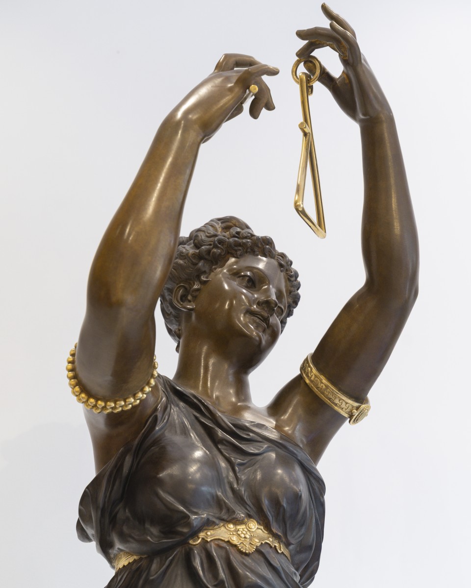 Dumaige démontre ici une parfaite maîtrise de la sculpture en bronze : les drapés sont rendus avec une virtuosité remarquable, tandis que les détails, bracelets, sandales, instruments sont rehaussés de bronze doré, dans un contraste raffiné avec la patine brune.