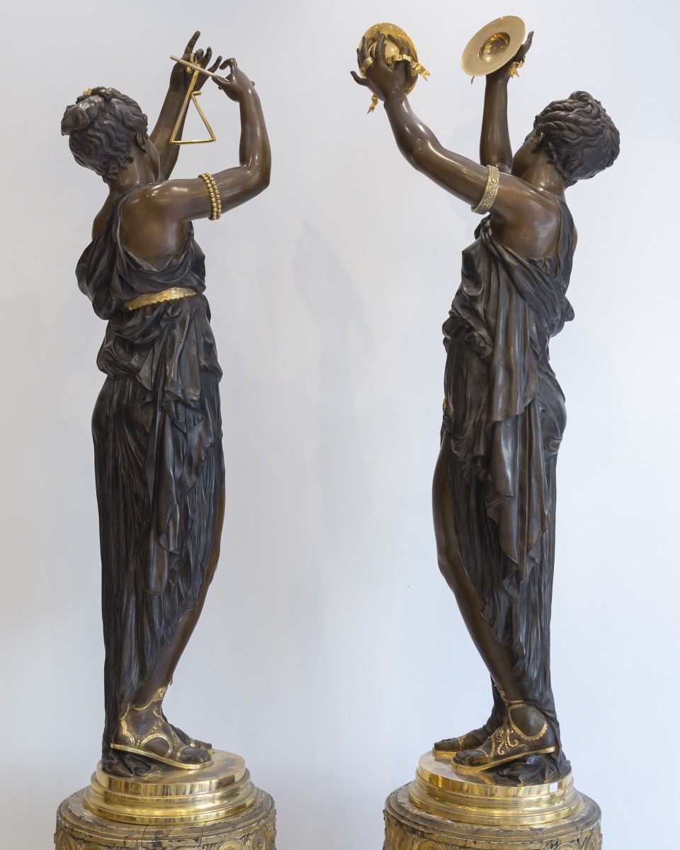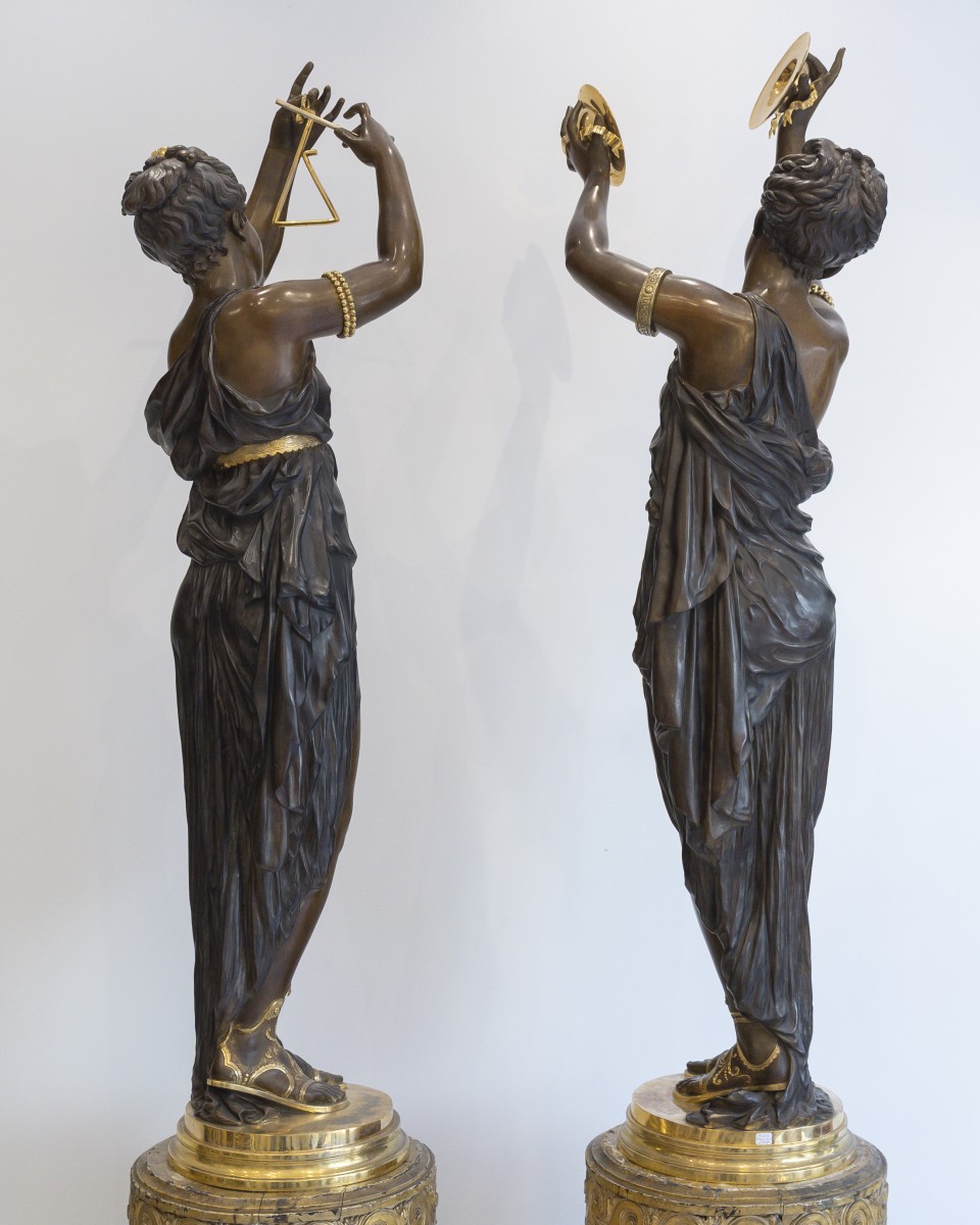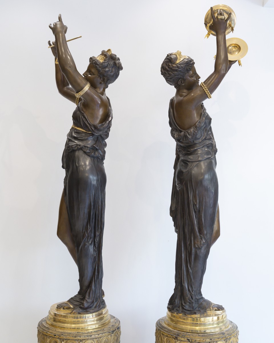 Retrouver le mobilier ou les objets d''art similaires à « Étienne Henri Dumaige (1830–1888) Monumentale paire de sculptures "Les Musiciennes" » présenté par Acropole Antiquités, antiquaire à Saint-Ouen dans la catégorie Sculpture en Bronze Napoléon III, Sculpture.