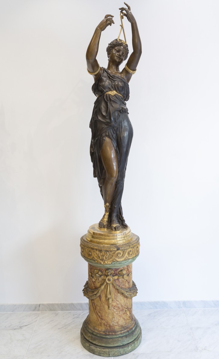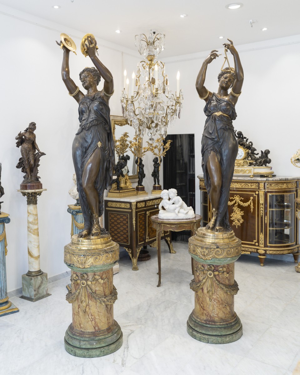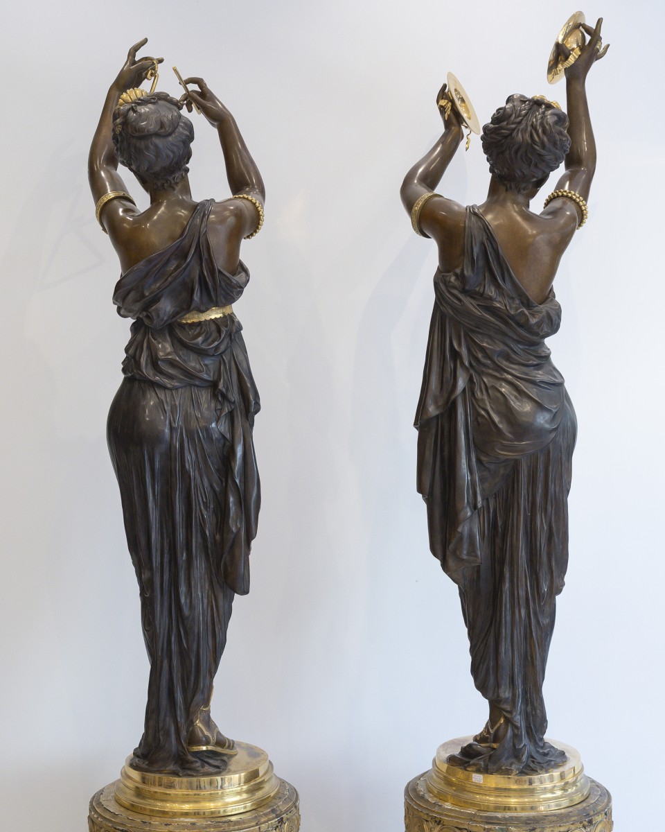 Retrouver le mobilier ou les objets d''art similaires à « Étienne Henri Dumaige (1830–1888) Monumentale paire de sculptures "Les Musiciennes" » présenté par Acropole Antiquités, antiquaire à Saint-Ouen dans la catégorie Sculpture en Bronze Napoléon III, Sculpture.