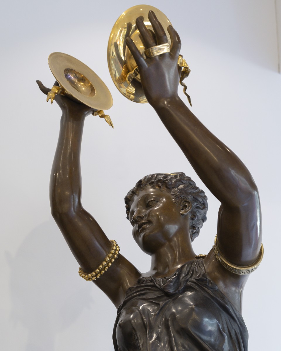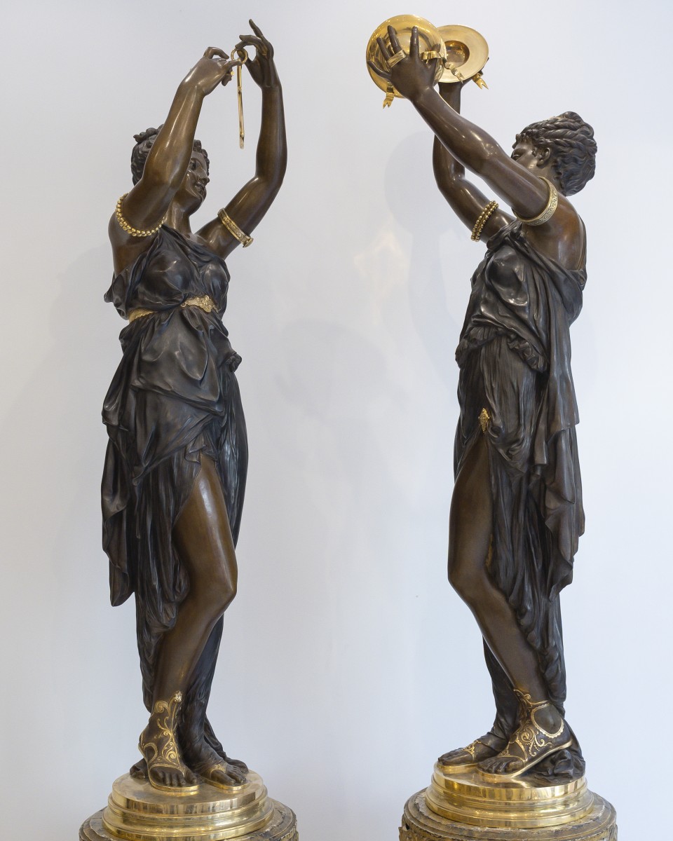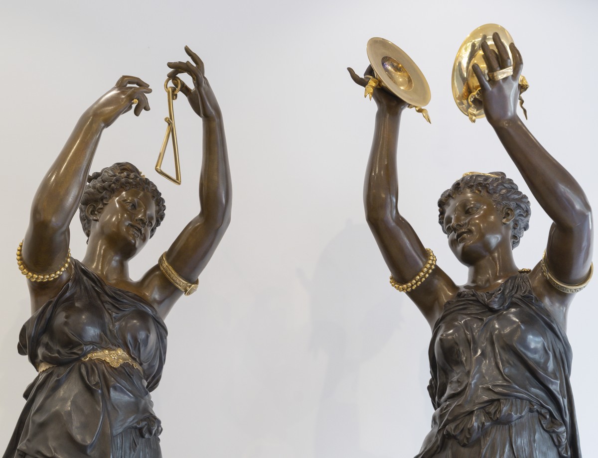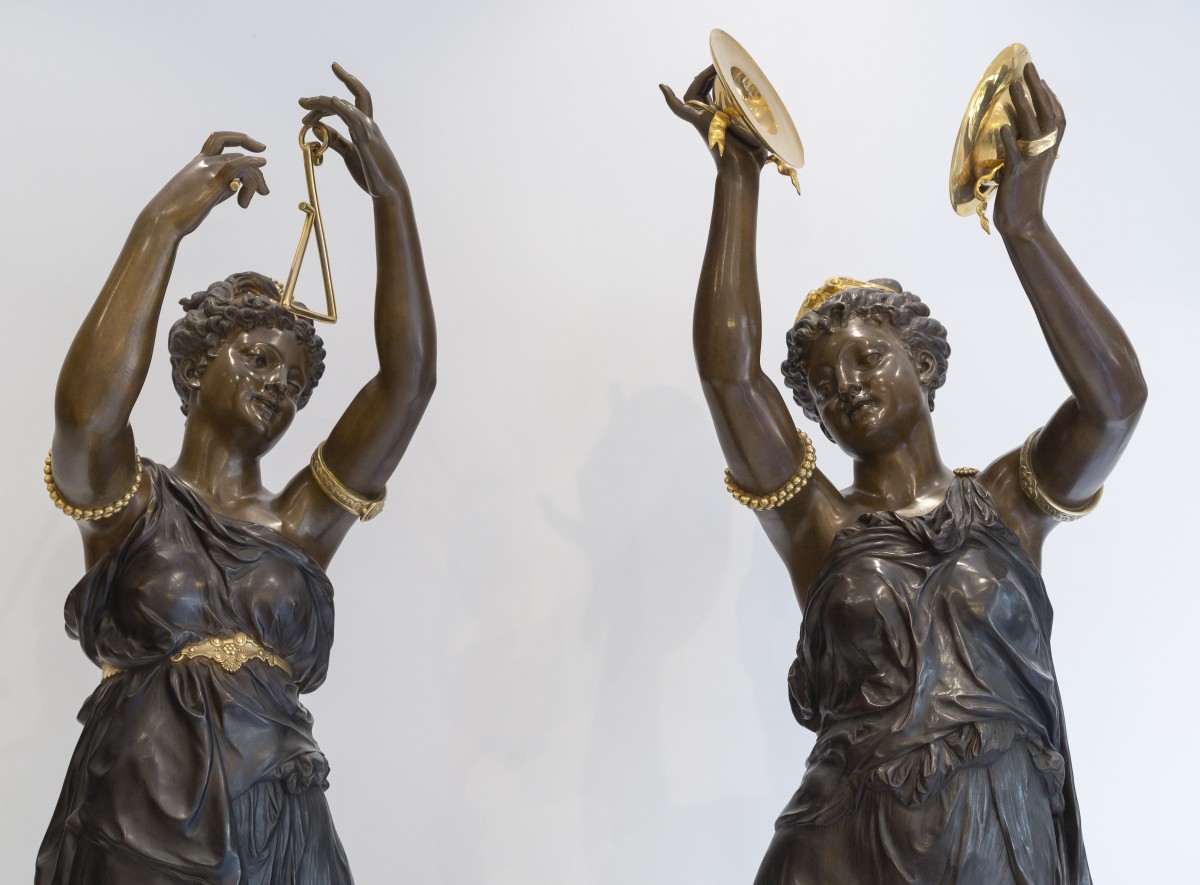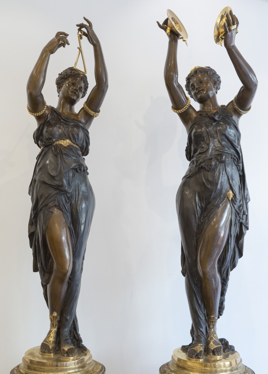 Les deux figures féminines, grandeur nature, représentent des allégories musicales : l’une brandit un triangle, l’autre joue des cymbales. Drapées à l’antique dans des tuniques à la fois légères et savamment modelées, elles incarnent la beauté idéale selon les canons académiques, alliant sensualité contenue et élévation spirituelle. Leur posture gracieuse, le port altier de la ...