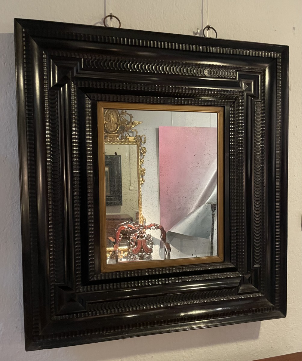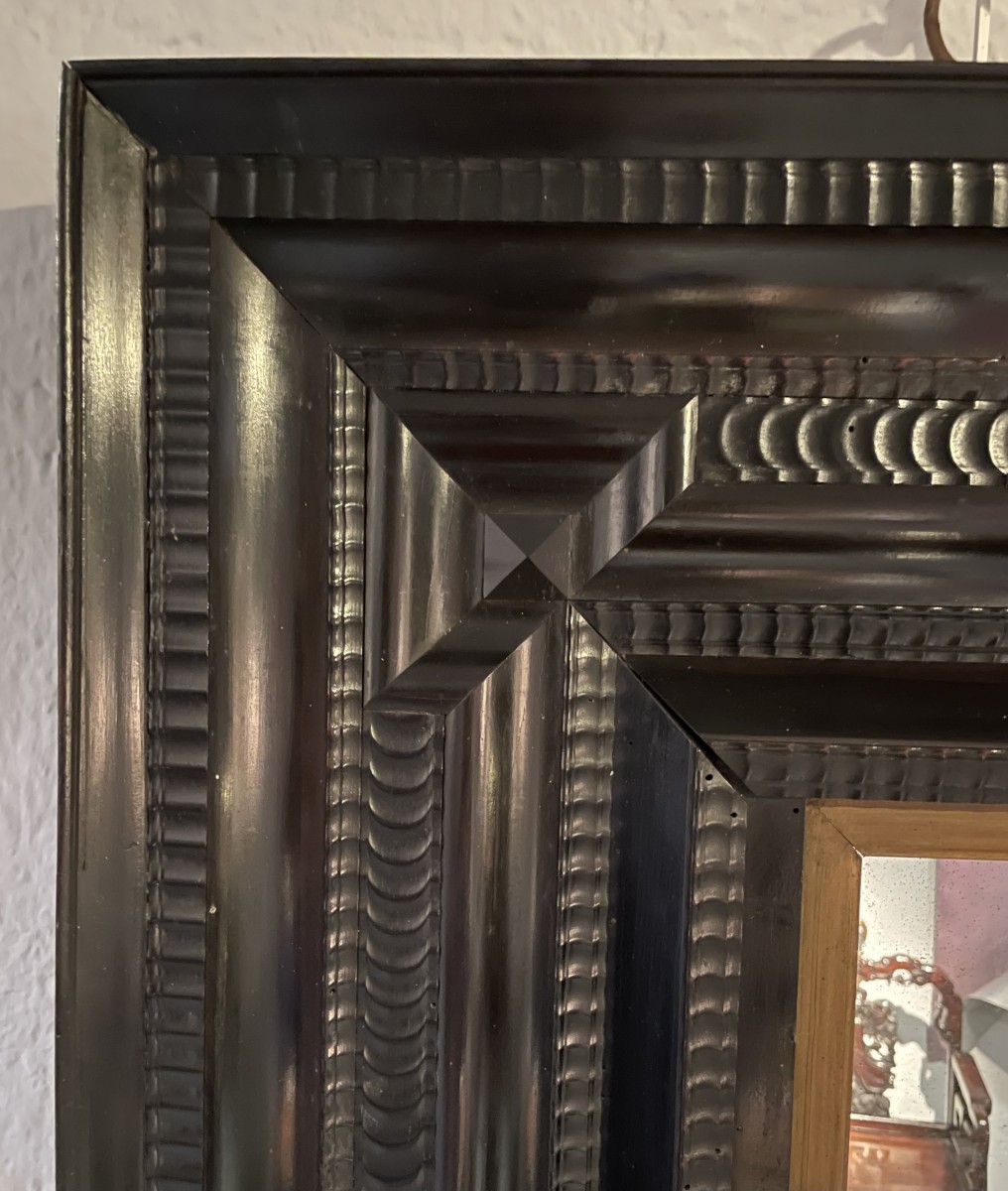 Exceptionnel miroir hollandais en bois plaqué et noirci. Moulures de 23 cm. de large en bois taillé et lisses . Travail qualité musée.