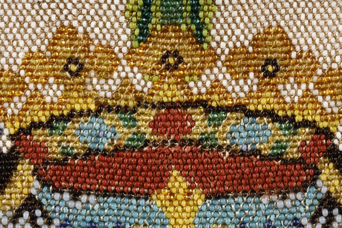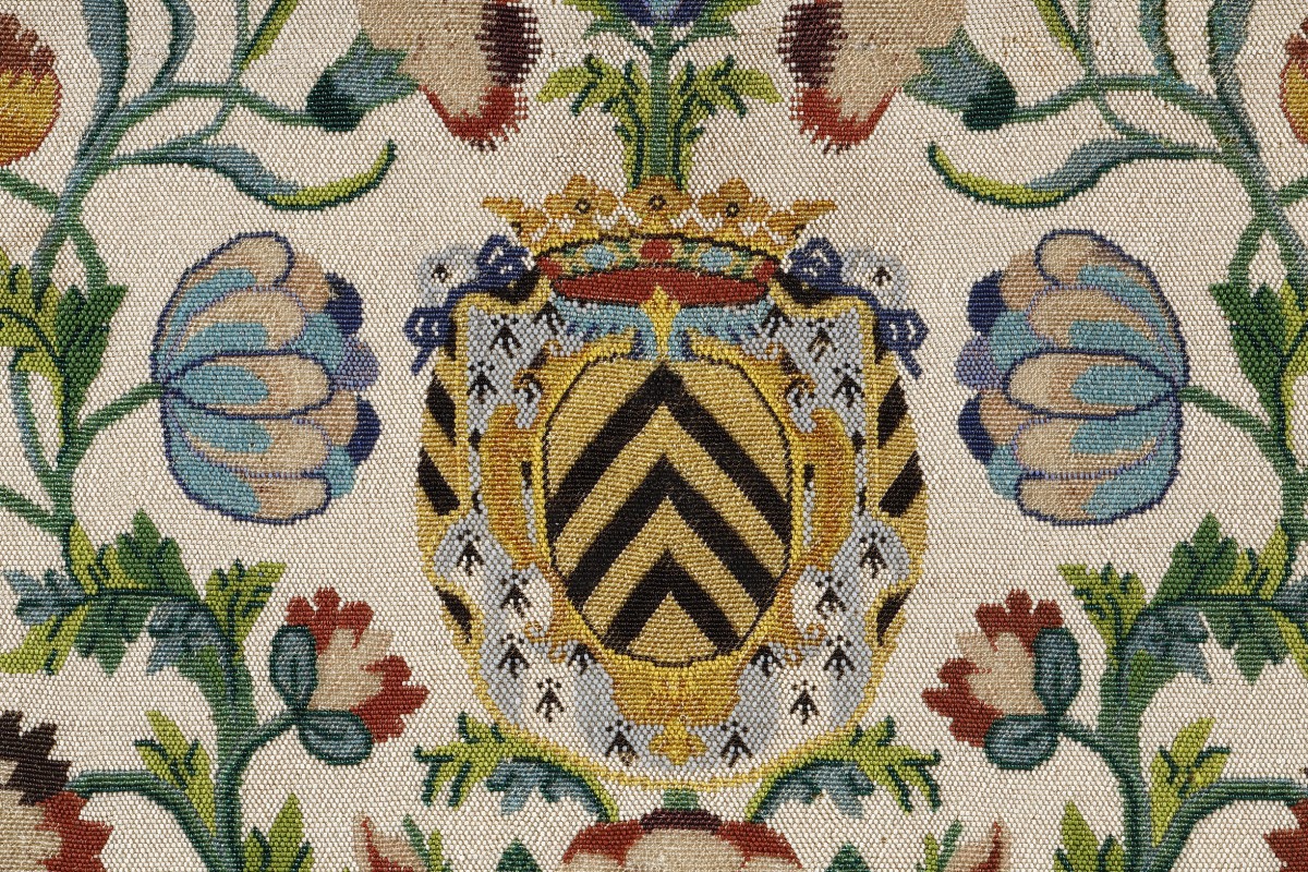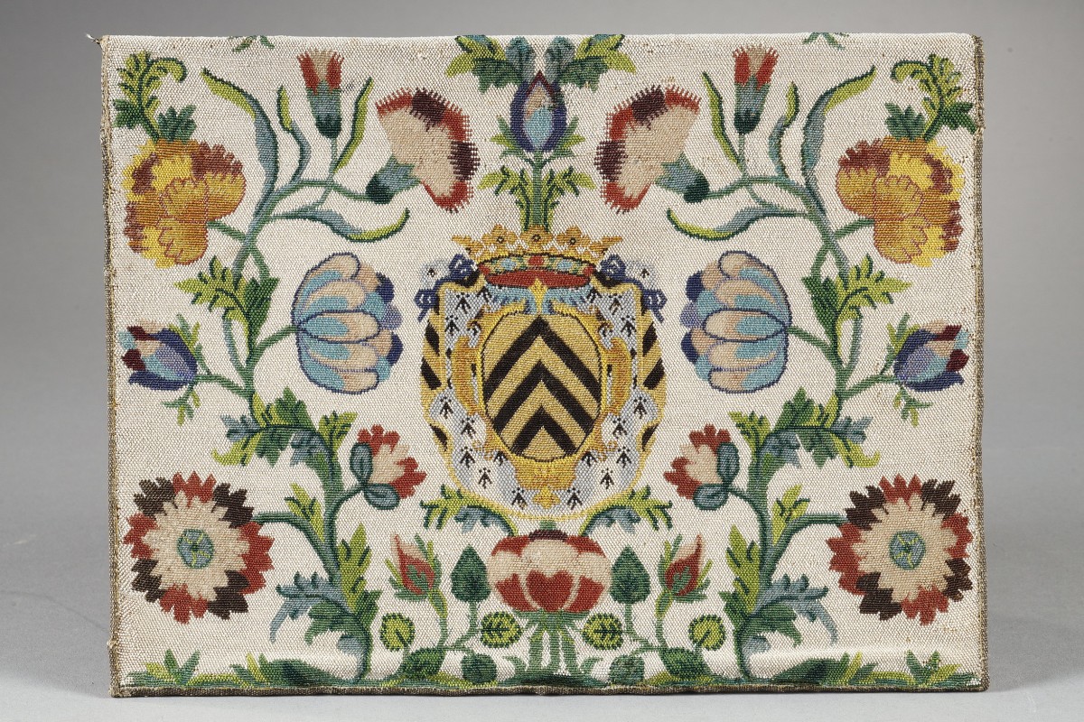 Grande et très rare pochette à documents de forme rectangulaire à rabat, entièrement réalisée en "sablé de perles de verre", technique textile rarissime d’une extrême finesse utilisée au 17ème et au 18ème siècle qui consistait à assembler des milliers de micro-perles ( d'environ 1 mm soit environ 150 perles par cm2 ) en un réseau serré formant une surface textile continue. Elle est décorée en polychromie de motifs floraux symétriques encadrant le blason des Ducs de Lévis Mirepoix ( d’or à trois chevrons de sable) sur fond d’hermine. 18-ème siècle Quelques très rares exemplaires dont une boite à mouches au Fine Arts Museum de Boston ( USA ) , plusieurs pièces en sablé de perles conservées au Musée de la Visitation à Moulins, quelques boites octogonales dans les Musées Vénitiens
