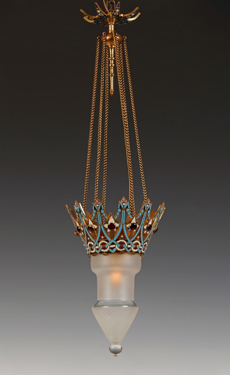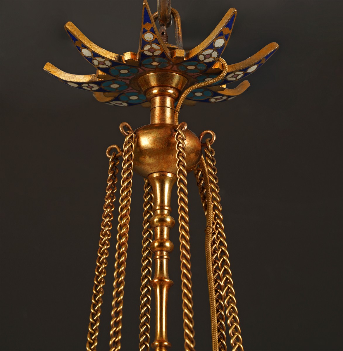 Élégant lustre à une lumière centrale attr. à F. Barbedienne, en bronze doré et émaux cloisonnés polychromes, relié à un plafonnier étoilé émaillé par des chaines qui supportent une couronne ajourée émaillée sertie de cabochons rouges rubis. Le tout se termine par une coupe dépolie gravée d’étoiles.