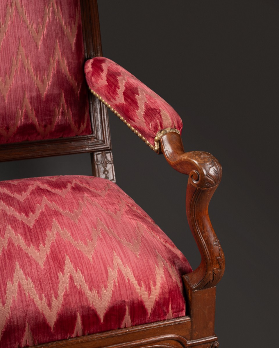 Grand fauteuil à châssis (le dossier et l'assise amovibles) en noyer, finement sculpté de rinceaux feuillagés ; les quatre pieds réunis par une large entretoise en "X". Garniture de velours ciselé en point de Hongrie.