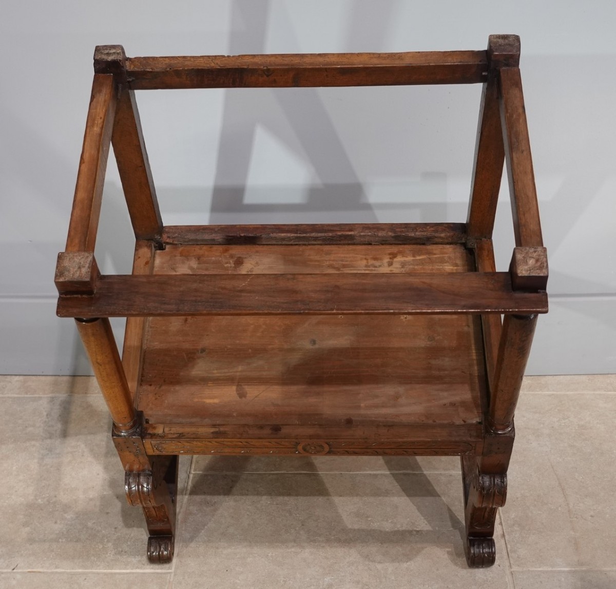 Le dossier est légèrement incliné et prolonge ses montants d'un décor de palmettes sculptées.