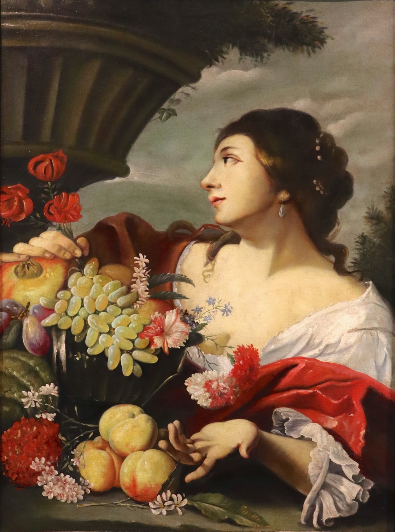 D'une main, elle saisit une branche fleurie, tandis que de l'autre, elle semble inviter le spectateur à admirer l'opulence de la composition, composée de fleurs et de fruits, qu'elle tient près d'elle.