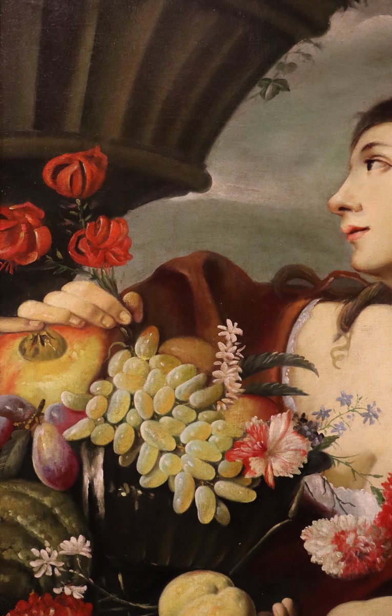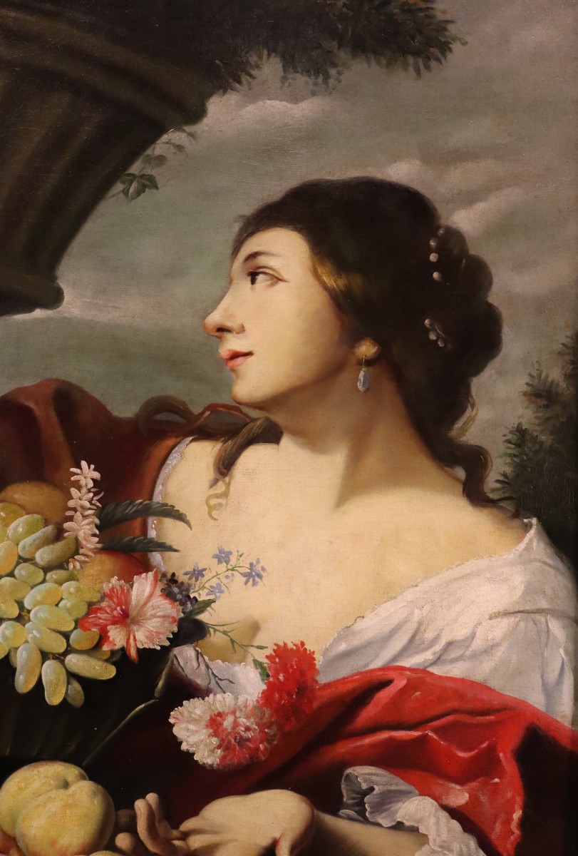 Retrouver le mobilier ou les objets d''art similaires à « Femme avec des fleurs et des fruits, atelier d'Abraham Brueghel (1631 - 1690) » présenté par Antichità Castelbarco, antiquaire à Riva del Garda dans la catégorie Tableaux XVIIe siècle Louis XIV, Tableaux et dessins.