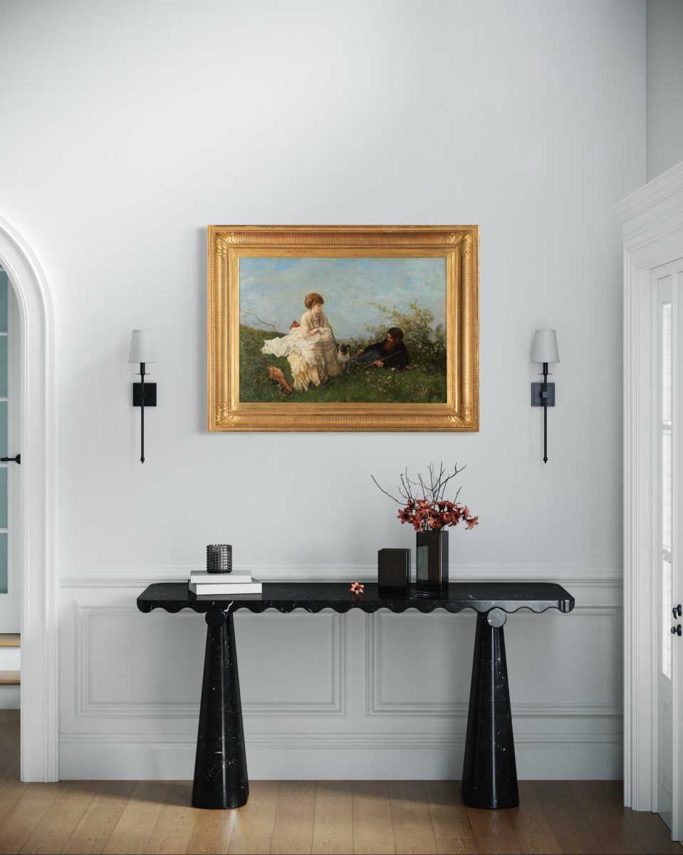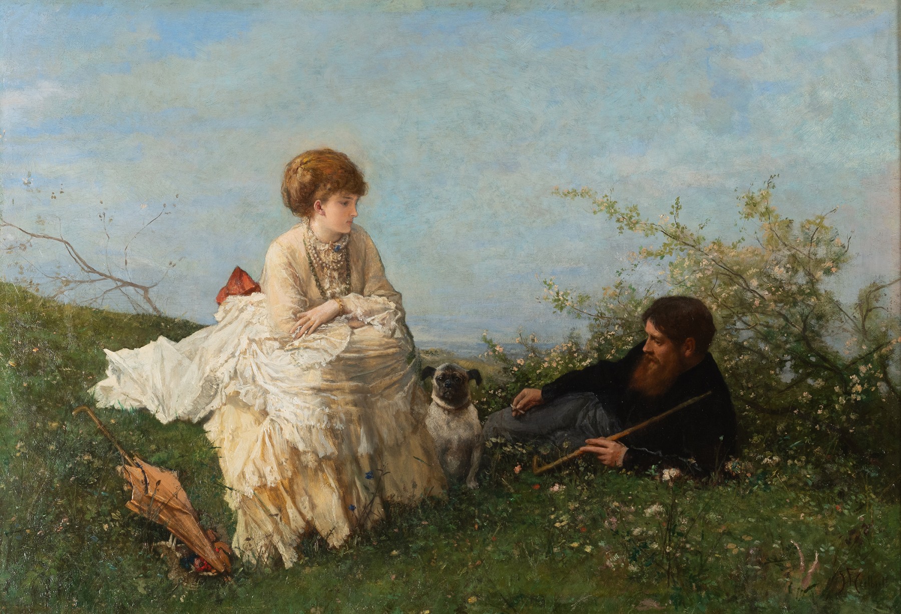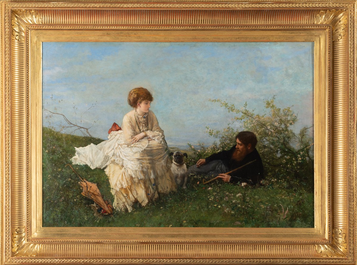 Cette peinture signée par Ferdinand Heilbuth, artiste du 19e siècle, illustre une scène empreinte de délicatesse et d’intimité. Le tableau met en scène une femme élégamment vêtue de blanc crème, assise sur une pelouse verdoyante, tandis qu’un homme barbu repose nonchalamment à ses côtés, une canne à la main. Un petit chien , un carlin est assis près de la femme, renforçant la douceur et le caractère informel de la scène.