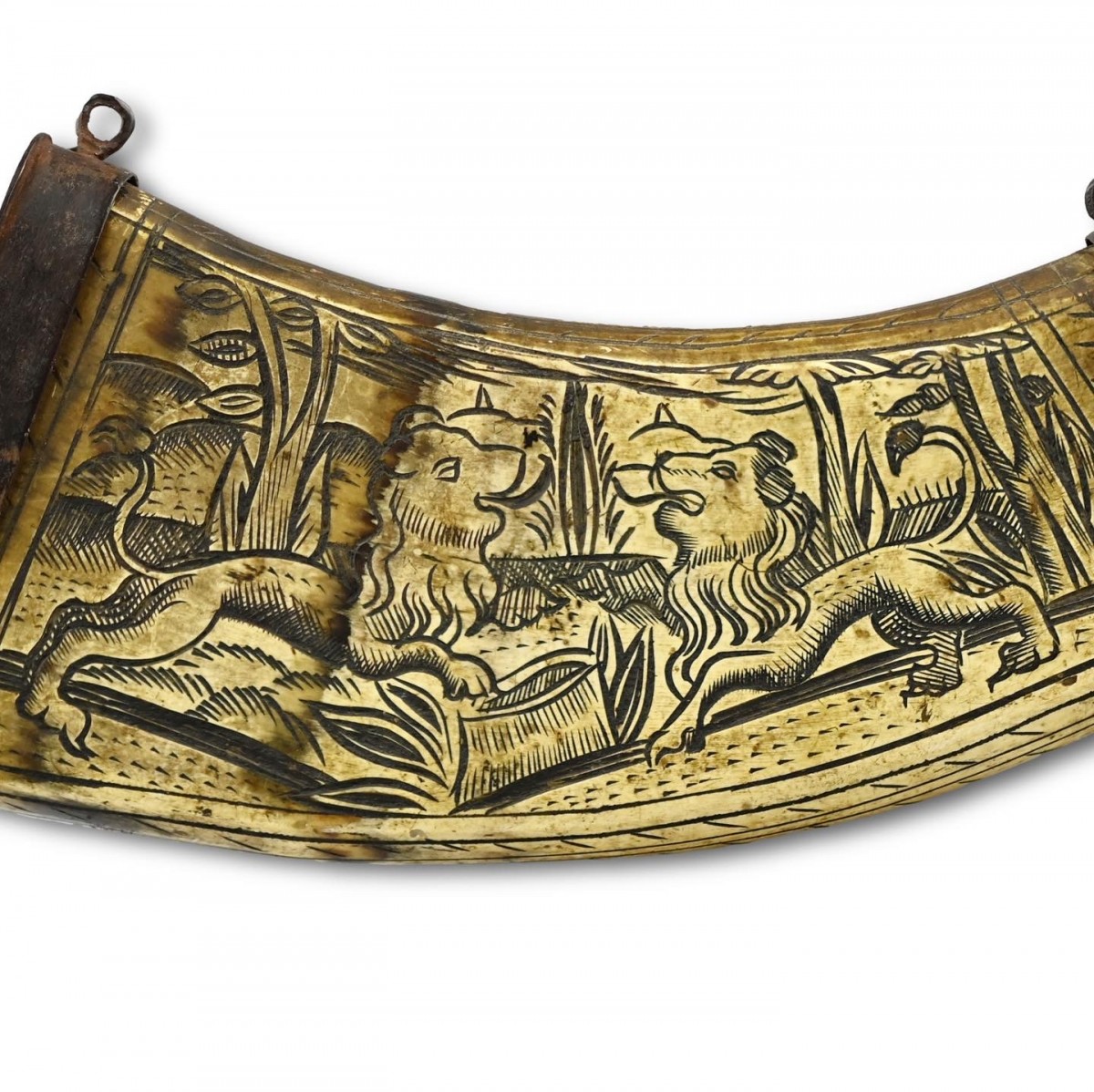 Flacon à poudre de corne de vache monté en fer et gravé de deux lions.