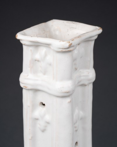 Rarissime flambeau « à la financière » à glaçure blanche avec un décor moulé de fleurs de lys.
