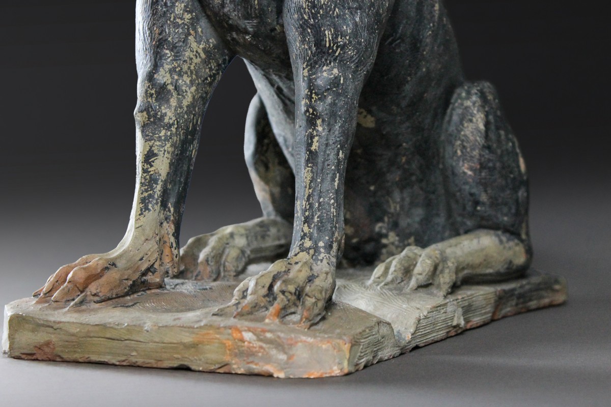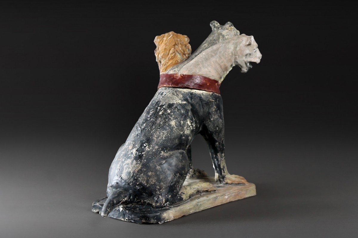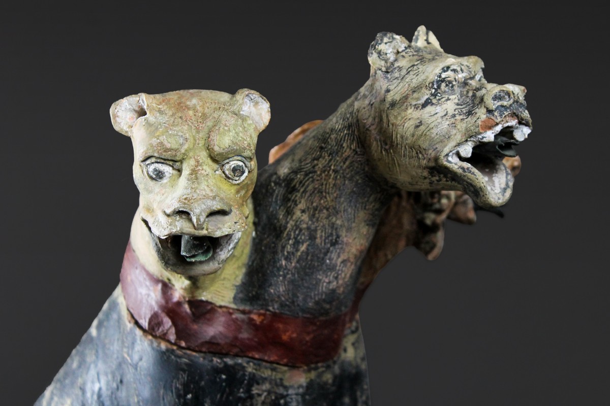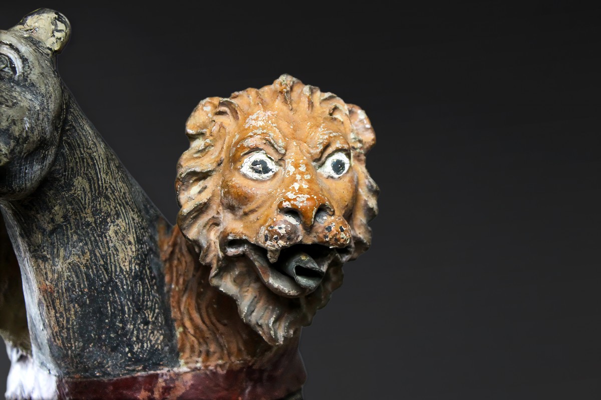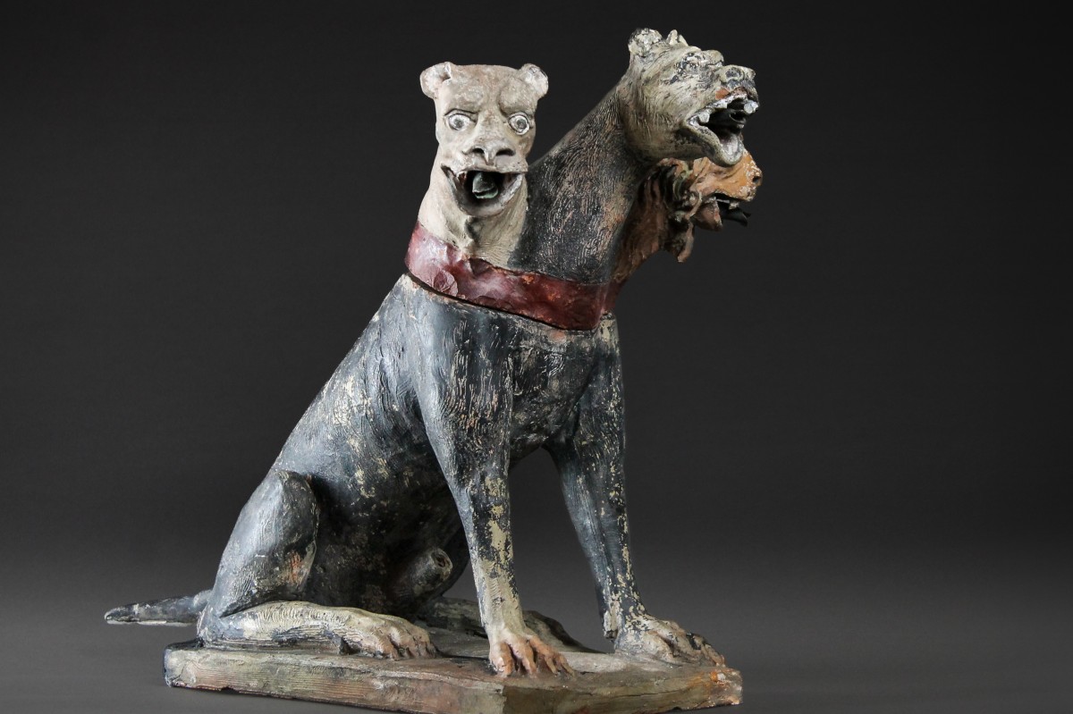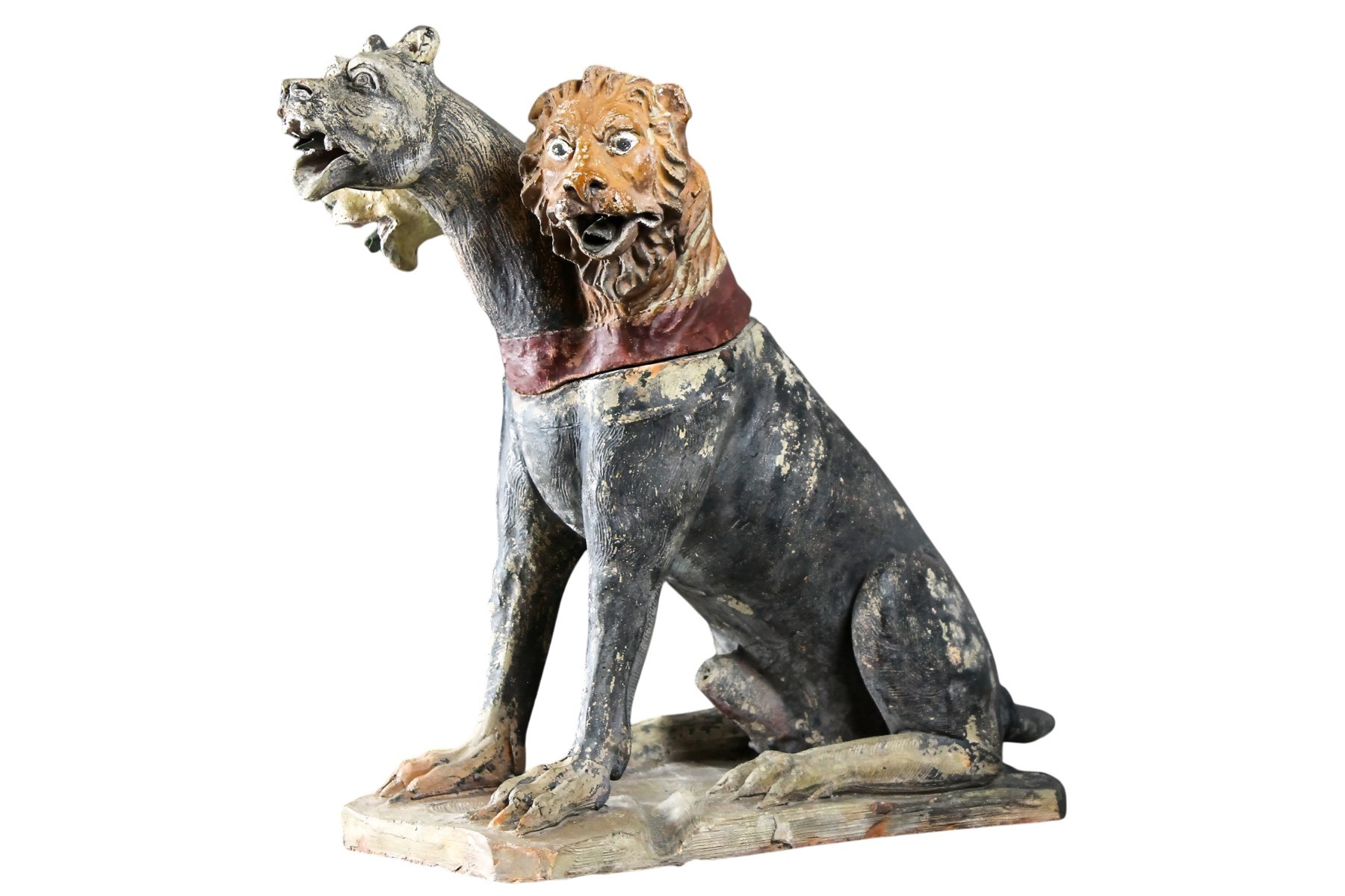 Fontaine italienne en terre cuite du XVIIIe, polychromie d’origine. Cerbère à trois têtes à l’imaginaire mythologique. La tête de gauche représente celle d’une lionne, la tête centrale celle d’un chien et la tête droite évoque un lion. Cette fontaine, à la fois fonctionnelle et décorative, devait constituer un élément spectaculaire dans un banquet ou une salle de réception.