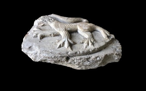 Retrouver le mobilier ou les objets d''art similaires à « Fragment en pierre calcaire avec un léopard héraldique. XVe siècle » présenté par Steven Bouchaert, antiquaire à Menen dans la catégorie Sculpture en pierre Moyen Âge, Sculpture.