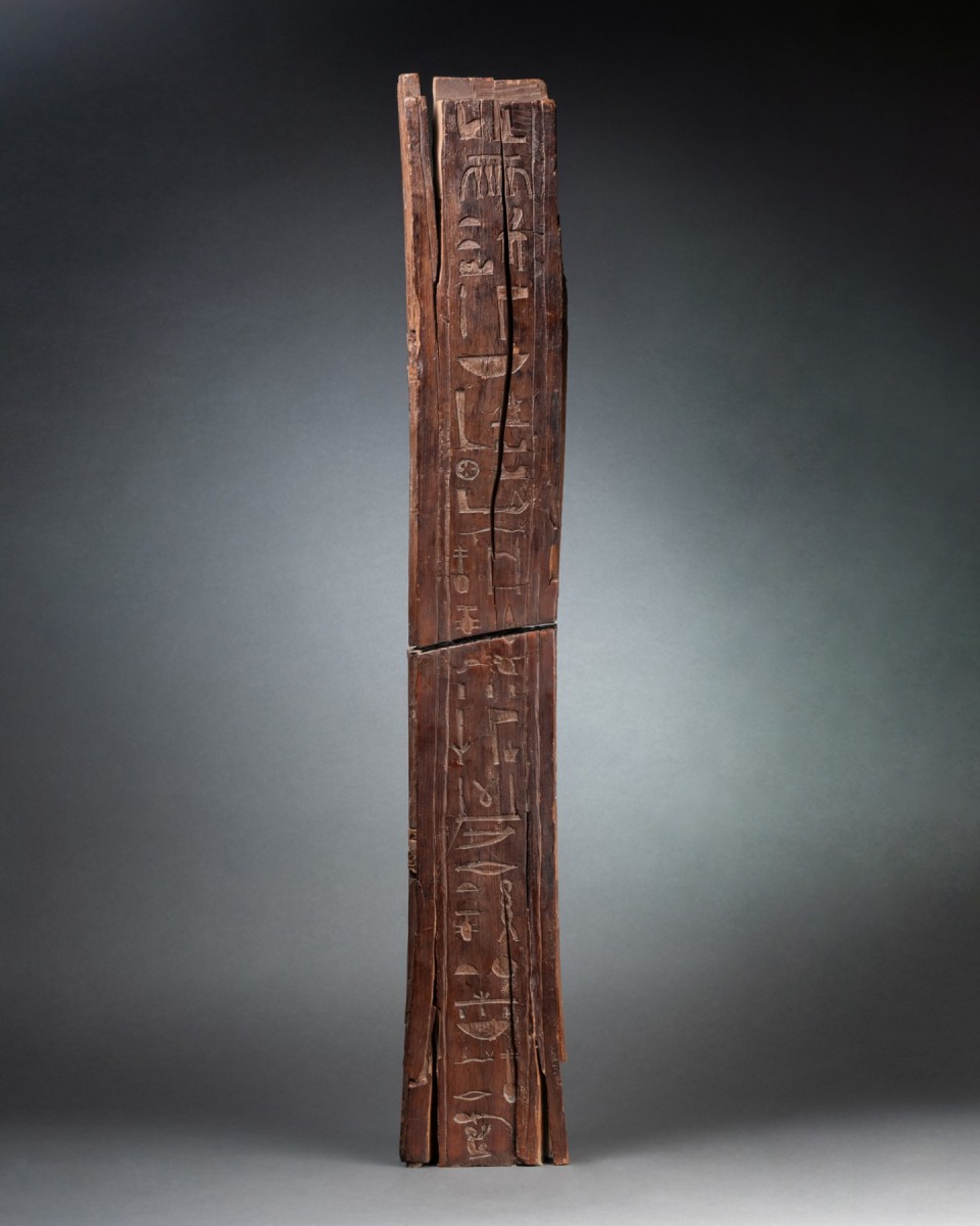 Ce montant d’angle constitue un rare témoin des cercueils en bois de la Basse Époque. Sa conservation en deux fragments complémentaires — aujourd’hui réunis pour la première fois depuis plus de cinquante ans — revêt une importance exceptionnelle. Les deux sections, dont l’une appartenait autrefois à la collection Chakib Slatine, ont pu être associées grâce à la concordance du fil du bois, des dimensions et de l’alignement des hiéroglyphes.