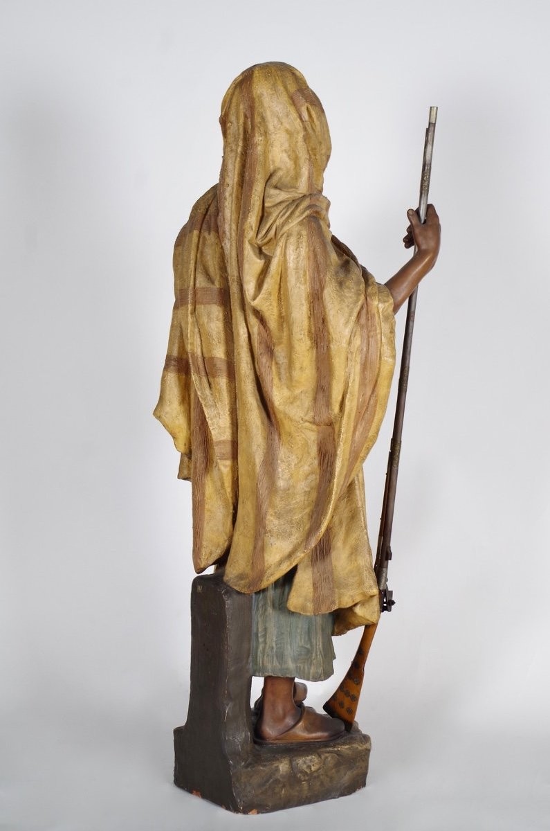 Grande terre-cuite orientaliste polychrome figurant le gardien du harem/palais.
