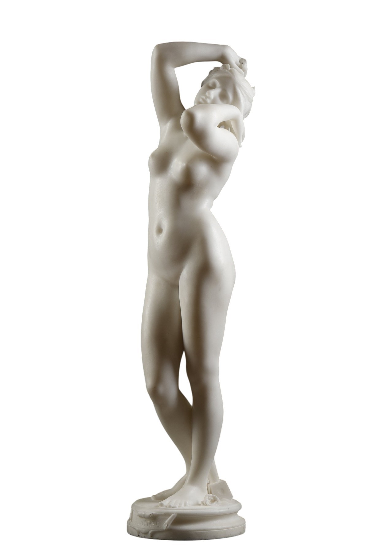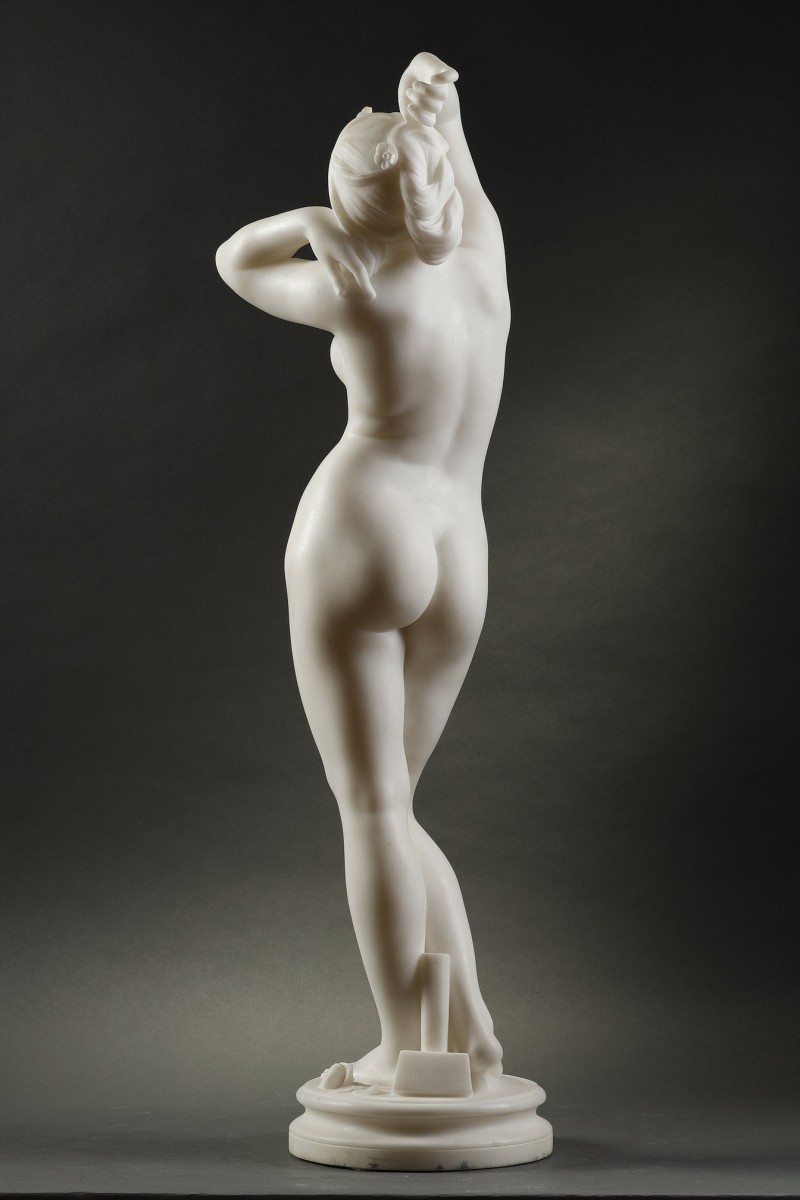 Le corps délicatement torsadé, les bras levés dans un geste protecteur ou de surprise, la jeune femme semble émerger lentement de son bloc originel. Le traitement du marbre, d’une finesse remarquable, capture la douceur de la chair naissante, tandis que le visage rêveur, à demi voilé par les bras, traduit la pudeur d’une être nouvellement éveillé au monde sensible.