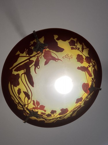 Retrouver le mobilier ou les objets d''art similaires à « Gallé - Suspension vasque Art nouveau rn verre gravé décor de capucines » présenté par Galerie Vaudemont, antiquaire à Nancy dans la catégorie Lustre Art nouveau, Luminaires.