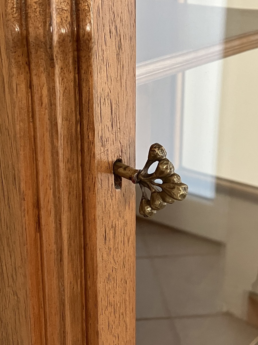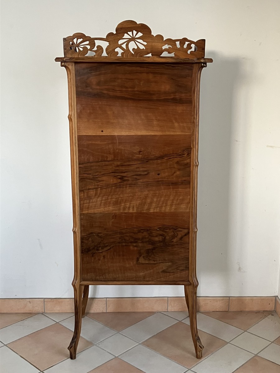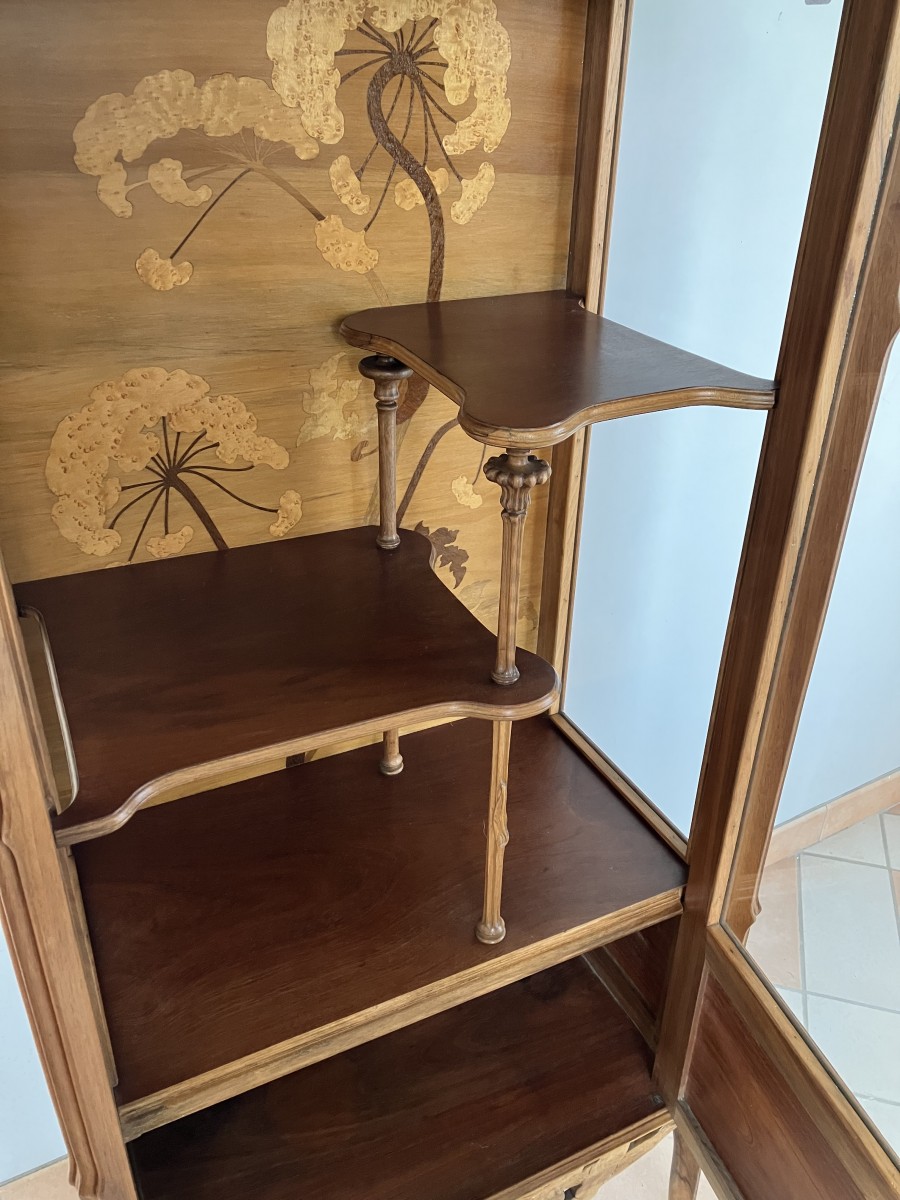 Décor marqueté également sur le même thème dans le panneau de la porte (les fleurs sont survolées par un papillon ) et sur les panneaux latéraux de la vitrine.