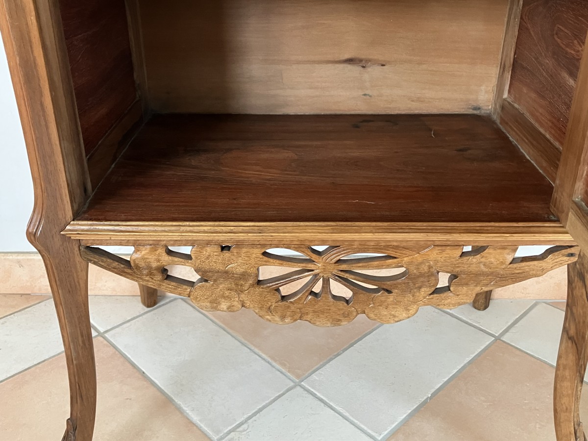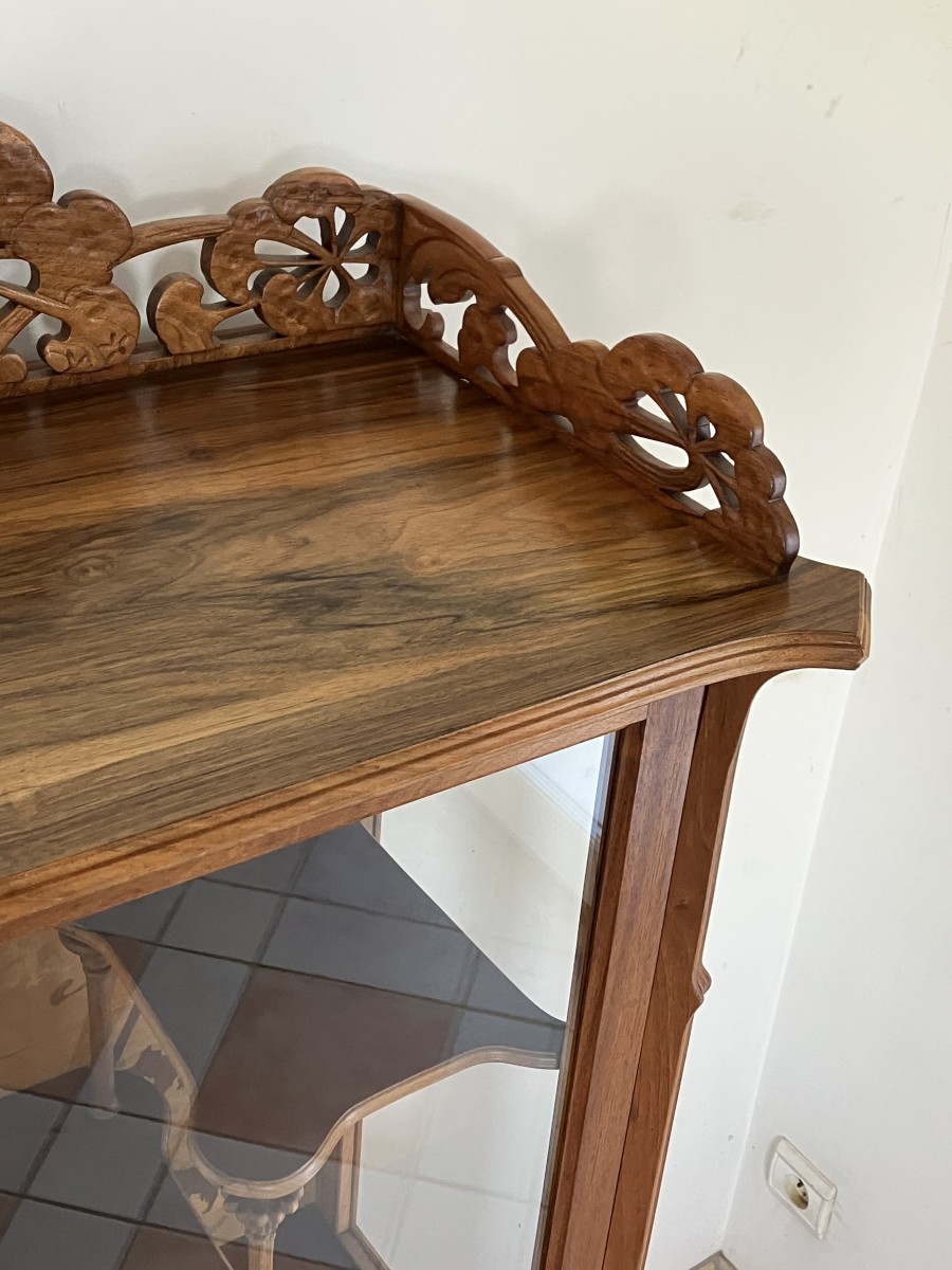 Rare vitrine aux ombelles en noyer mouluré et sculpté, ouvrant par une porte vitrée découvrant deux étagères décalées en quinconce.