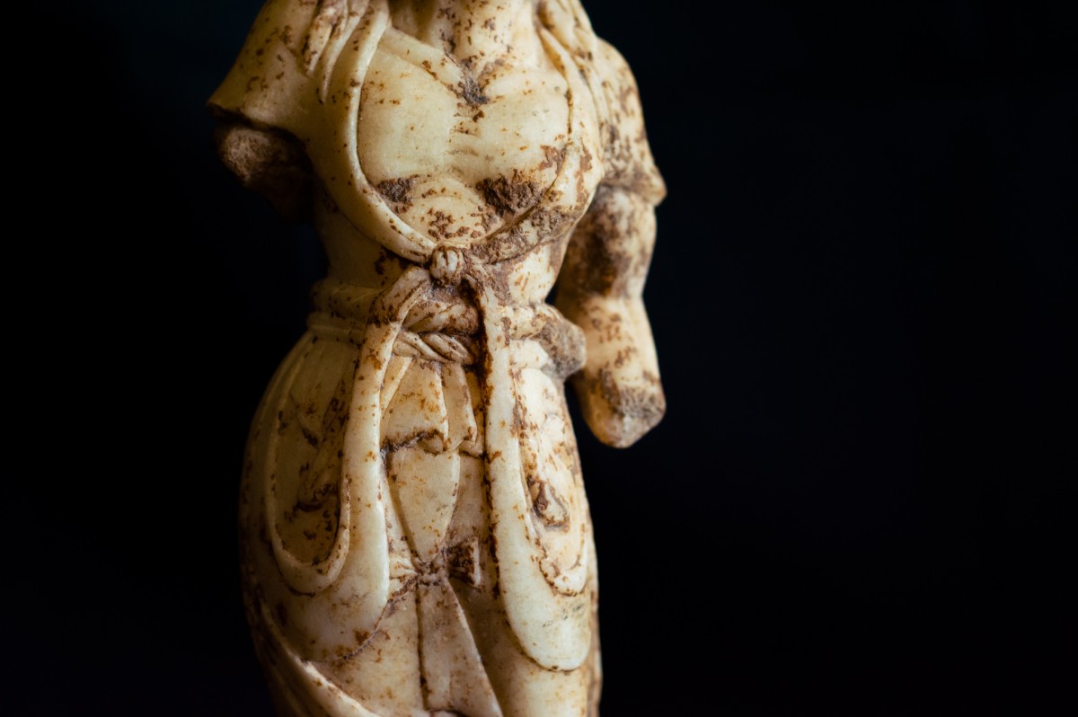 Cette rare sculpture de gardien en marbre de la dynastie Tang provient de la divinité bouddhiste indienne Vajrapani. Il s'agit d'un gardien qui se tient à côté des bouddhas et des bodhisattvas en tant que protecteur dans les sites rituels tels que les temples et les grottes. La sculpture en marbre a été réalisée en utilisant une approche réaliste, cohérente avec les figures funéraires en terre cuite produites au cours de la même période. Le gardien a une expression faciale courroucée et féroce, résolue à menacer les maux. La poitrine exposée révèle des muscles pectoraux denses, et les pieds exagérément grands se tiennent fermement sur le rocher. Les bras manquants nous amènent à l'imaginer tenant des armes ou montrant les poings, démontrant son pouvoir divin. La posture est hellénistique avec le poids de la figure maintenu légèrement sur le côté gauche du corps. Par conséquent, cette figure peut être appelée « ...