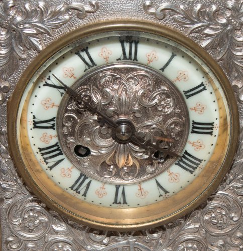 Garniture de cheminée en bronze argenté et doré richement ciselé de motifs floraux avec en façade le monogramme AD (Alfred Daubrée)