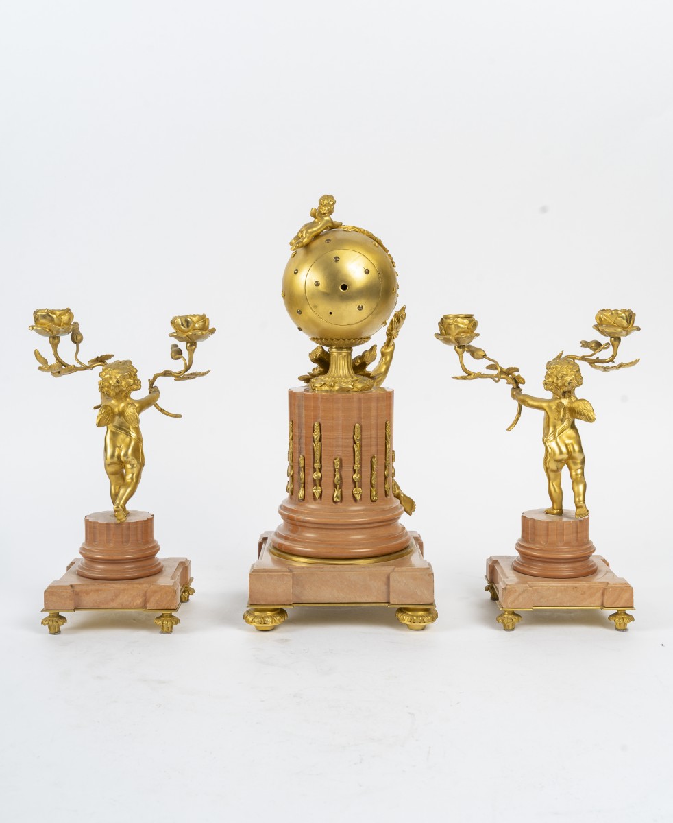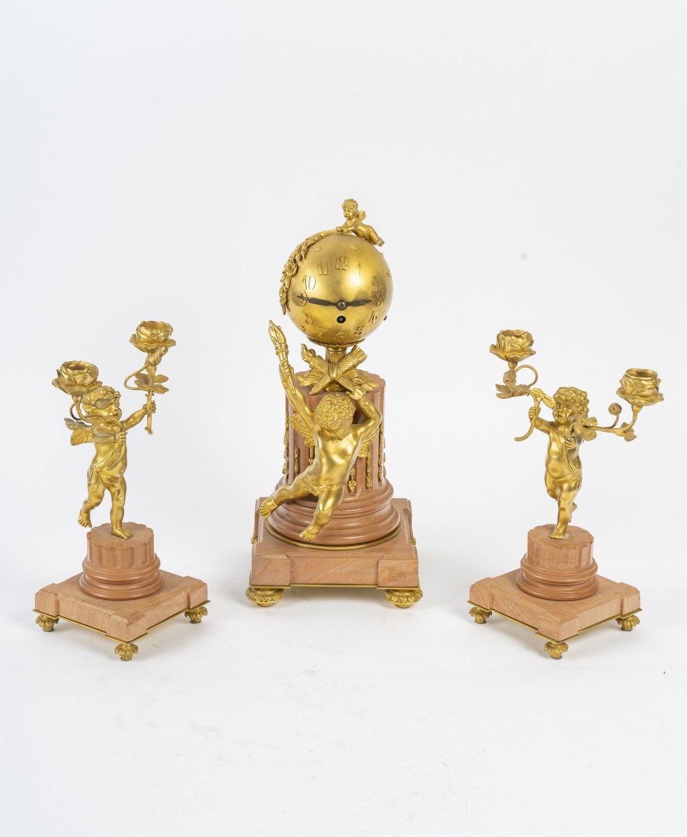 Superbe garniture de cheminée de la fin du 19ème siècle, comprenant une pendule et ses deux candélabres.