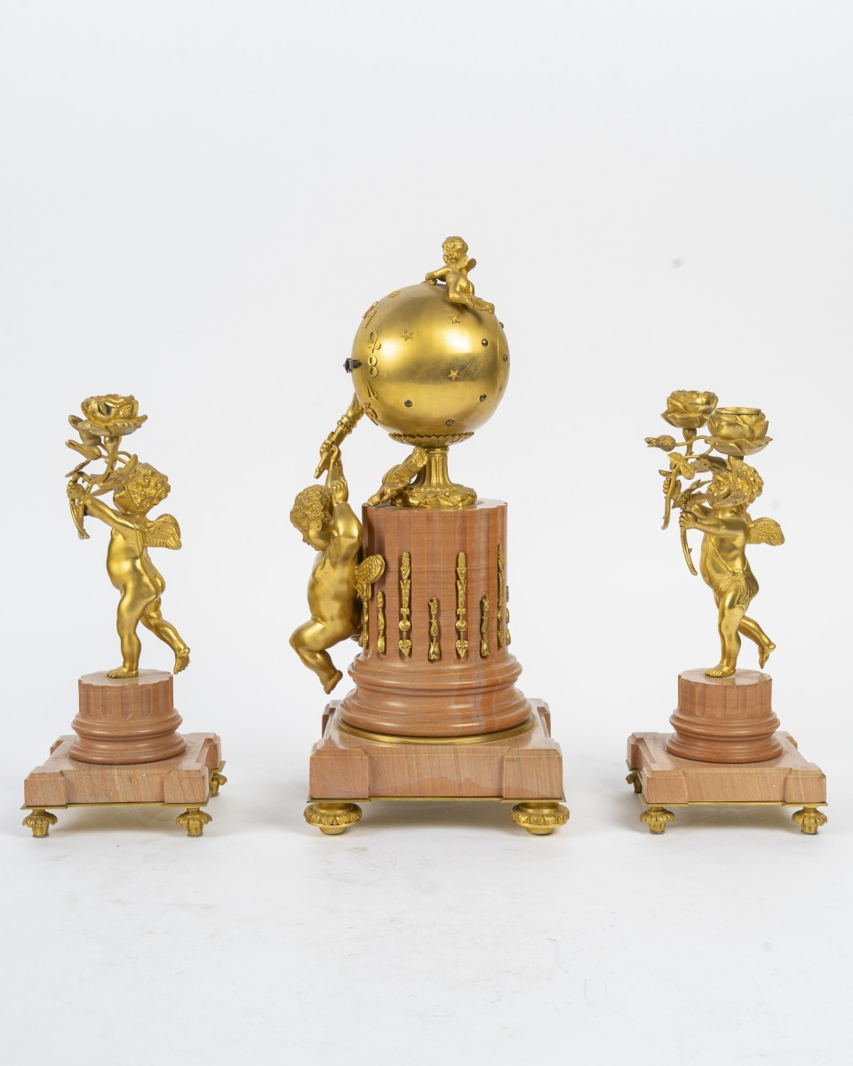 Retrouver le mobilier ou les objets d''art similaires à « Garniture de cheminée circa 1880 » présenté par Acropole Antiquités, antiquaire à Saint-Ouen dans la catégorie Pendule Napoléon III, Horlogerie.