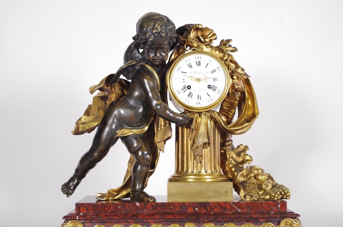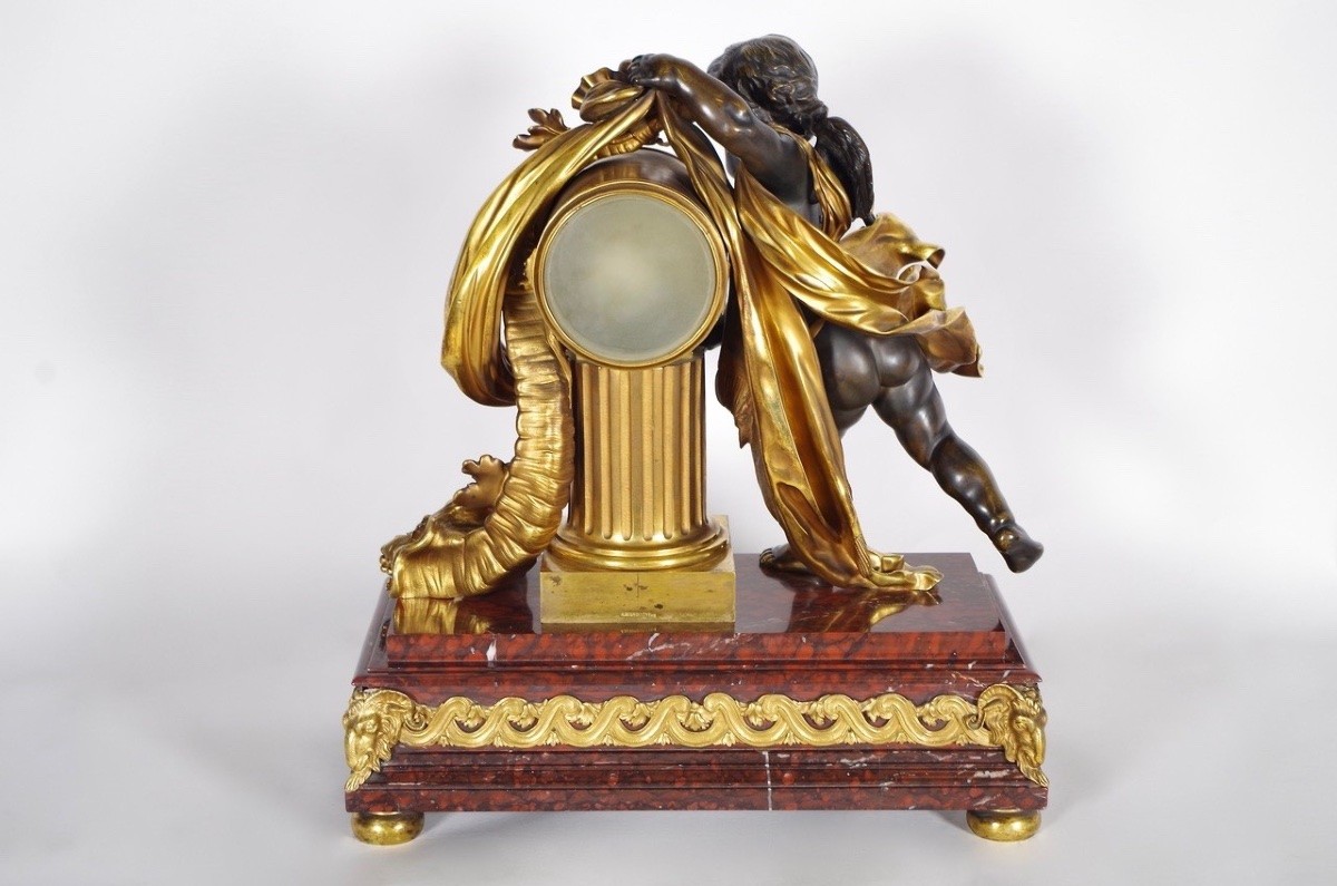 La pendule présente un angelot drapé pointant du doigt le temps, et enrubannant une borne à la corne d’abondance.