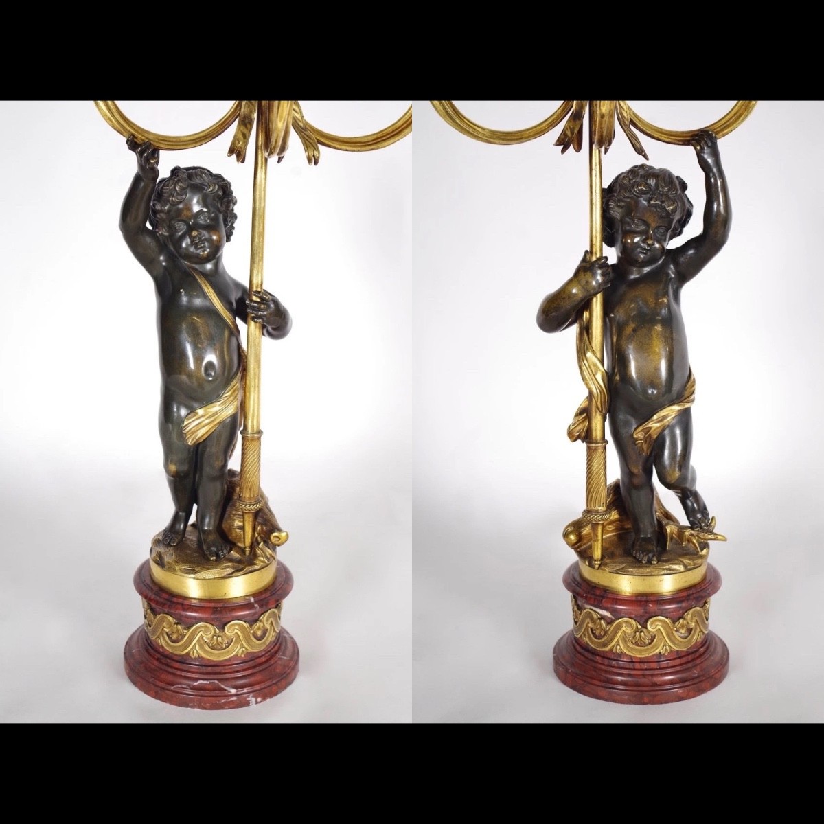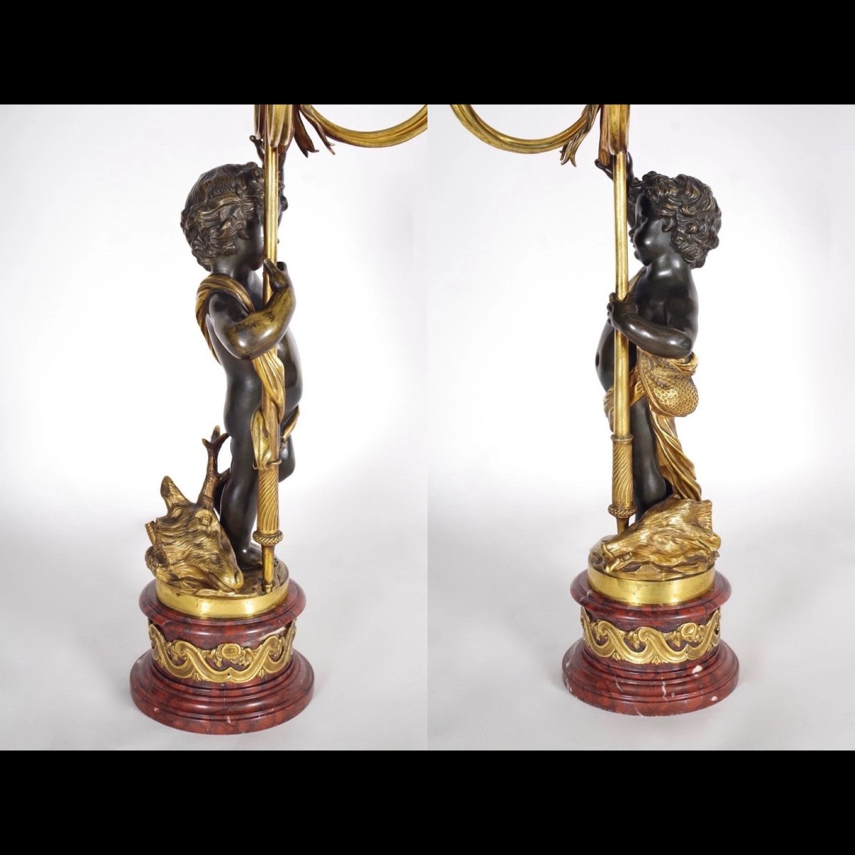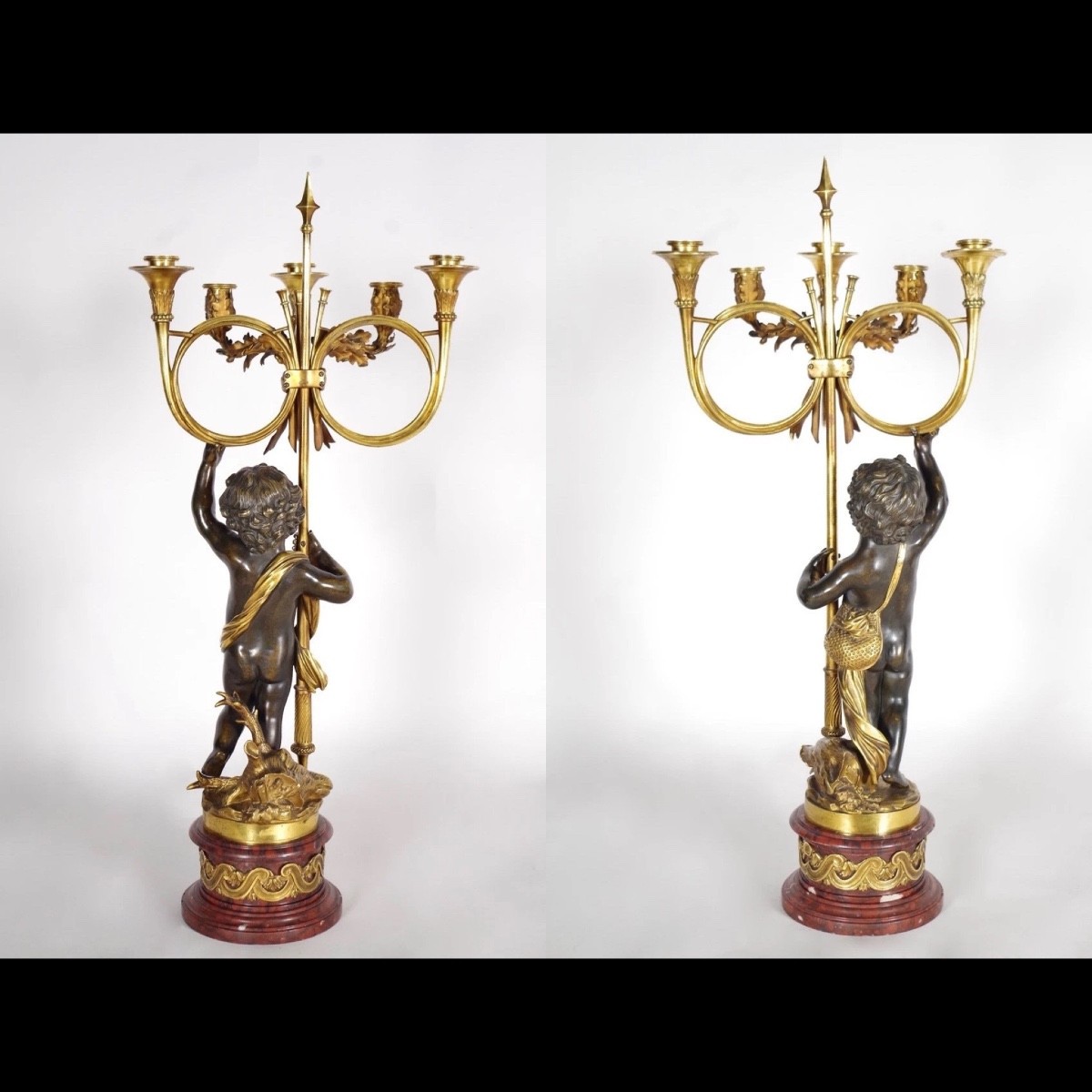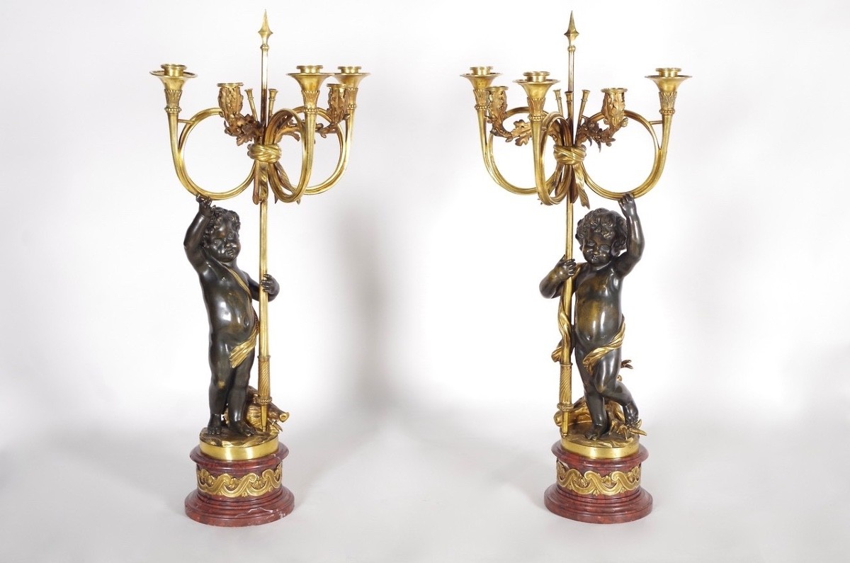 Les candélabres, d’après Clodion, présentent des chérubins soutenant cinq bras de lumières avec à leurs pieds des trophées de chasse (têtes de sanglier et cerf).