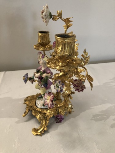 Une rare garniture en porcelaine de Meissen et bronze très finement ciselé et doré d'époque Louis XV.