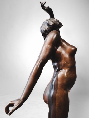 Datée du tournant du siècle, cette grande figure (83 cm) incarne avec éclat l’esthétique Art Nouveau : lignes sinueuses, sensualité maîtrisée, célébration du corps féminin comme vecteur d’émotion et de beauté organique. Le geste est fluide, rythmé, presque musical – le regard suit naturellement la courbe ascendante du bras jusqu’au visage incliné, dans une pose qui conjugue abandon et élégance classique.