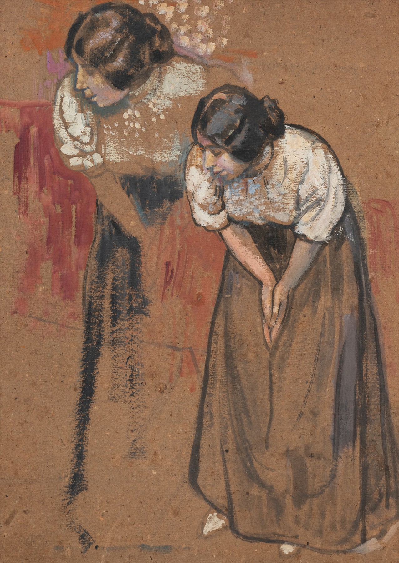 La matière picturale est visible, avec des touches larges et des superpositions qui traduisent le caractère d’étude. La palette, dominée par des tons bruns, ocres et sourds, est ponctuée de rehauts plus clairs sur les corsages, soulignant la structure des figures.