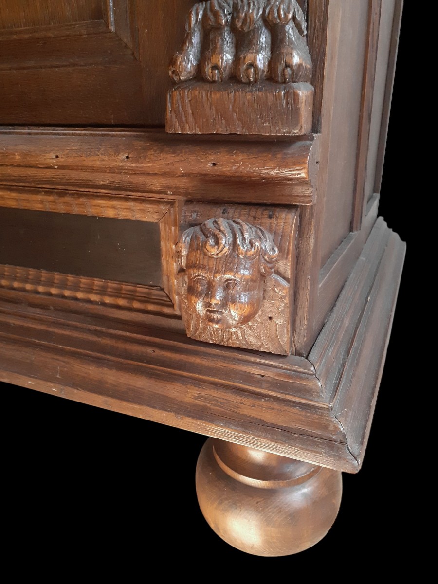 Grand Bahut Anversoise en chêne sculpté et placage de bois noir (Kussenkast).