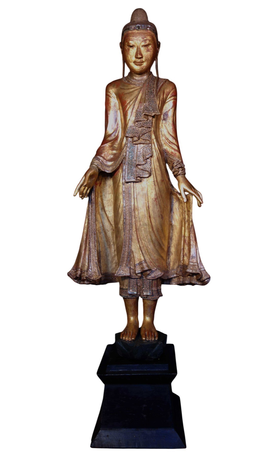 Reposant sur sa base lotiforme, le Bouddha debout est la représentation d’une action compatissante, la position des mains se rapproche du Varada-mudra qui symbolise le don et la générosité.