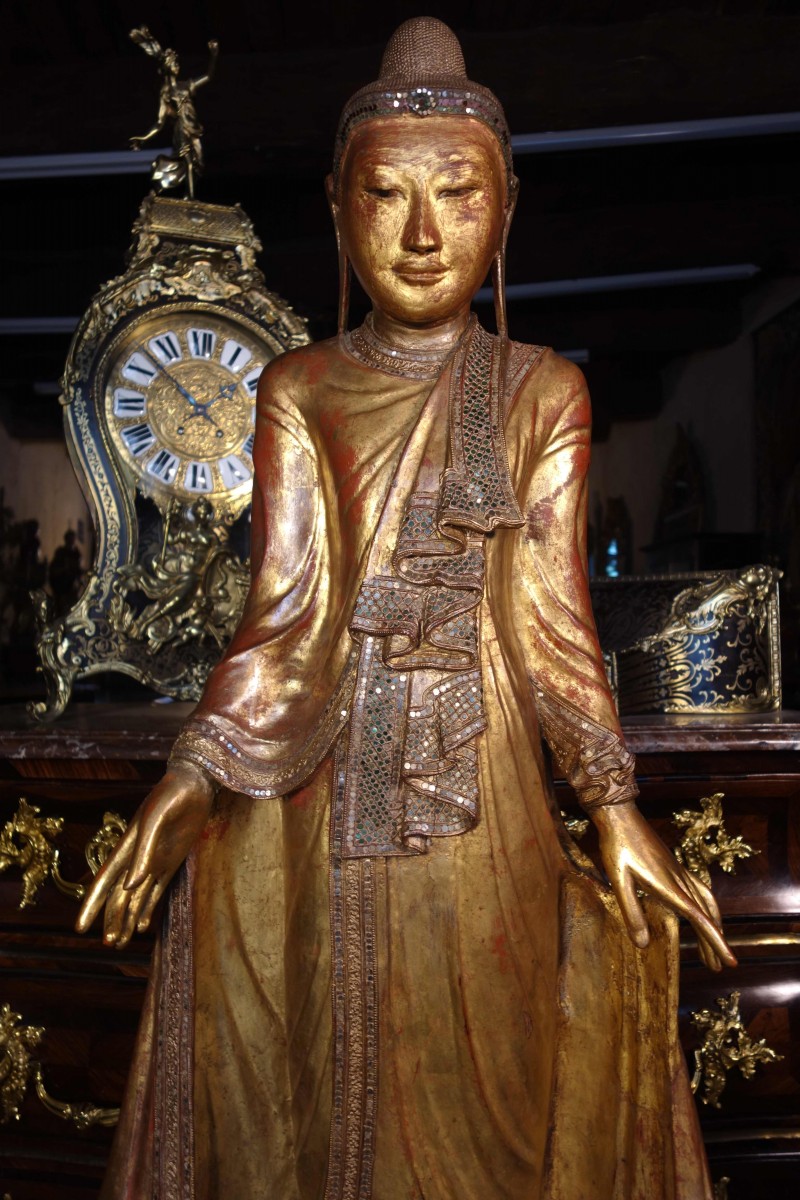 En bois sculpté doré, la tenue de l’Éveillé au visage calme et serein est agrémentée de nombreuses insertions de verre de différentes couleurs.