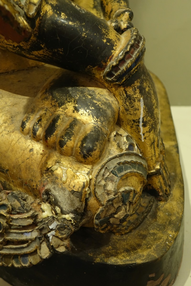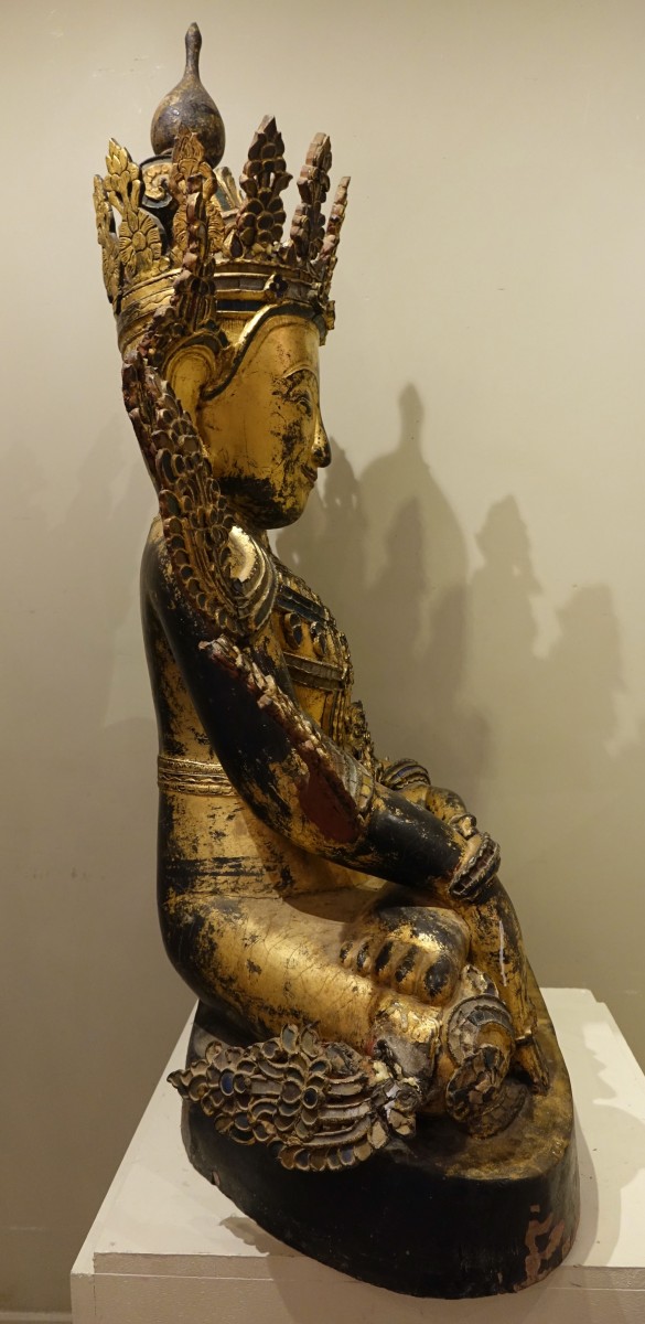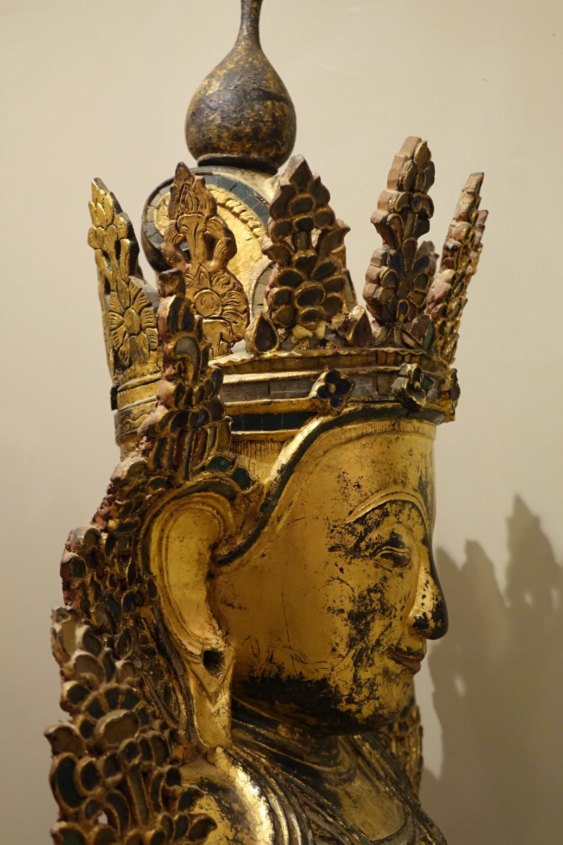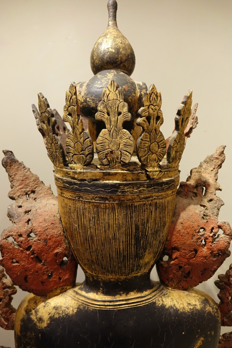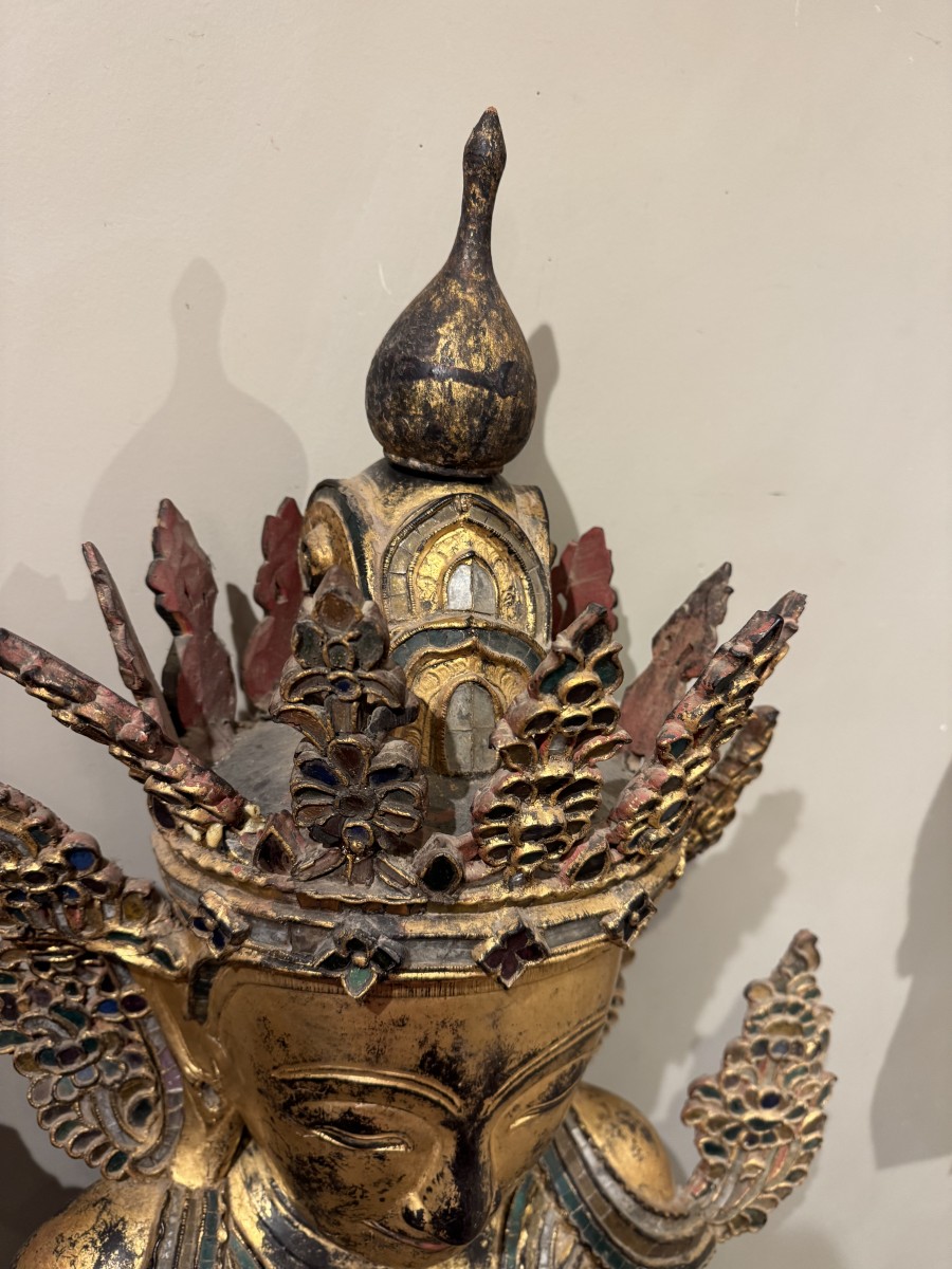 Grand Bouddha en bois peint à décor de verroteries représenté en Bhumisparsa mùdra, ou geste de la prise de la terre à témoin. Ce geste représente l'Eveil de Bouddha . Il tient une grande place dans l'imagerie Bouddhiste , car il est le symbole de la victoire sur Mâra( la mort, le démon , le grand lieu des désirs et des passions ). Mâra tenta d'interrompre la méditation de Bouddha en lui présentant toutes les distractions possibles. Bouddha, en réponse, touche la terre , faisant appel à la nature et à la déesse terre Sthavara pour témoigner de sa résolution . Birmanie, fin du 19e s. Accidents et éclats à la polychromie, mais très belle présence 110x 62x37