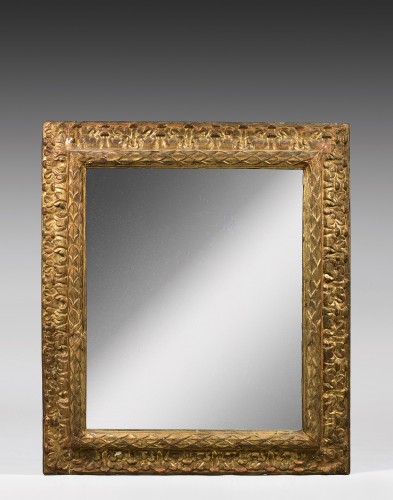 Grand cadre en bois sculpté et doré à profil renversé monté en miroir à décor de frise de feuilles de laurier et rinceaux feuillagés.
